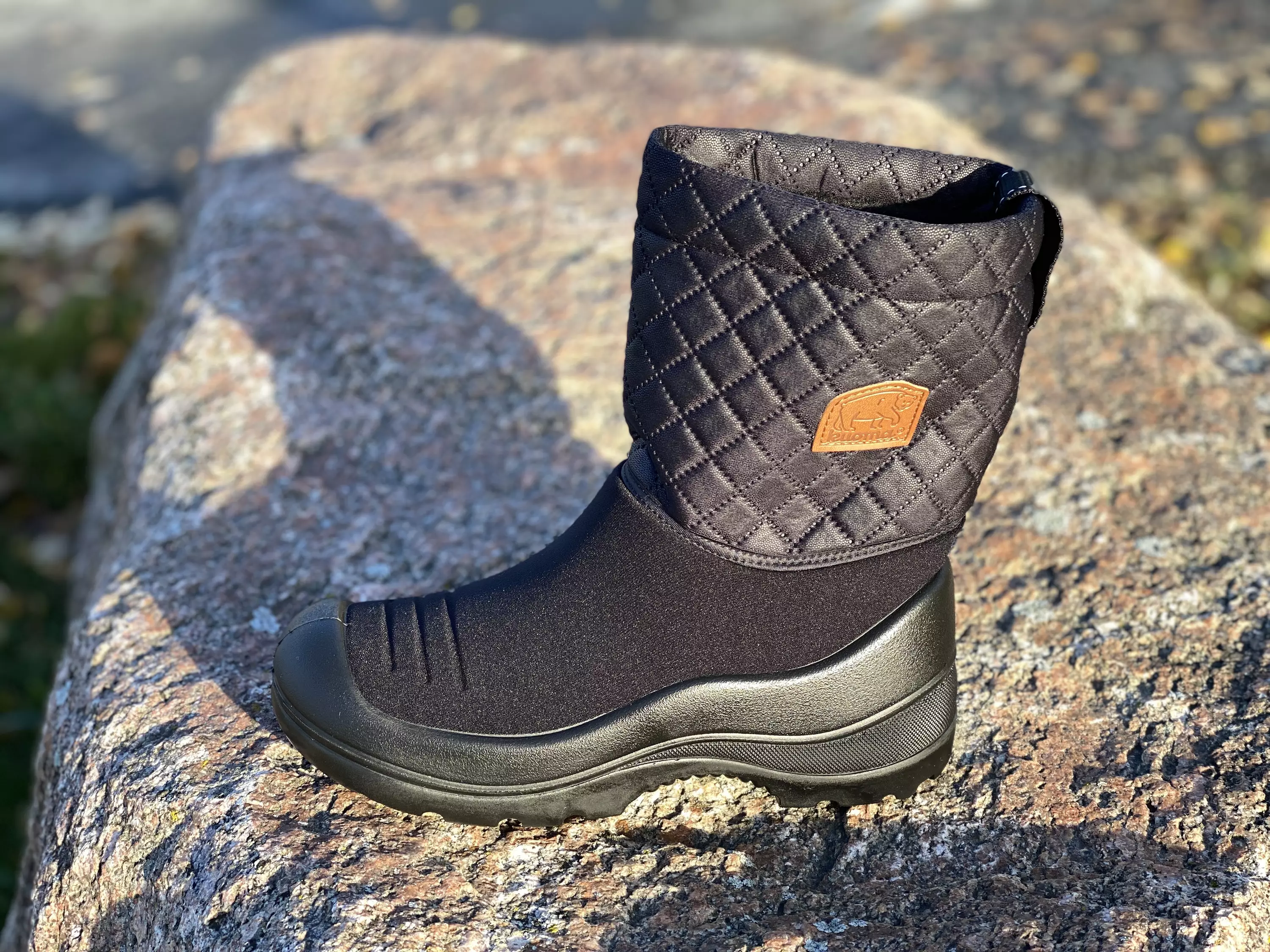 Mustat Kuoma Ilona talvisaappaat. Upea tikkikankainen varsi, jonka ulkosyrjälle sijoitettu ruskea Kuoma karhu-merkki. Tyylikäs valinta niin kaupunkiin kuin metsäretkelle. Kengän alaosa on vesitiivis, malli on kevyt ja lesti tilava. Pinta hylkii vettä ja likaa. Lämmin teddyvuori. Kaksi pohjallista, joilla voit helposti säätää talvisaappaan sisätilavuutta.