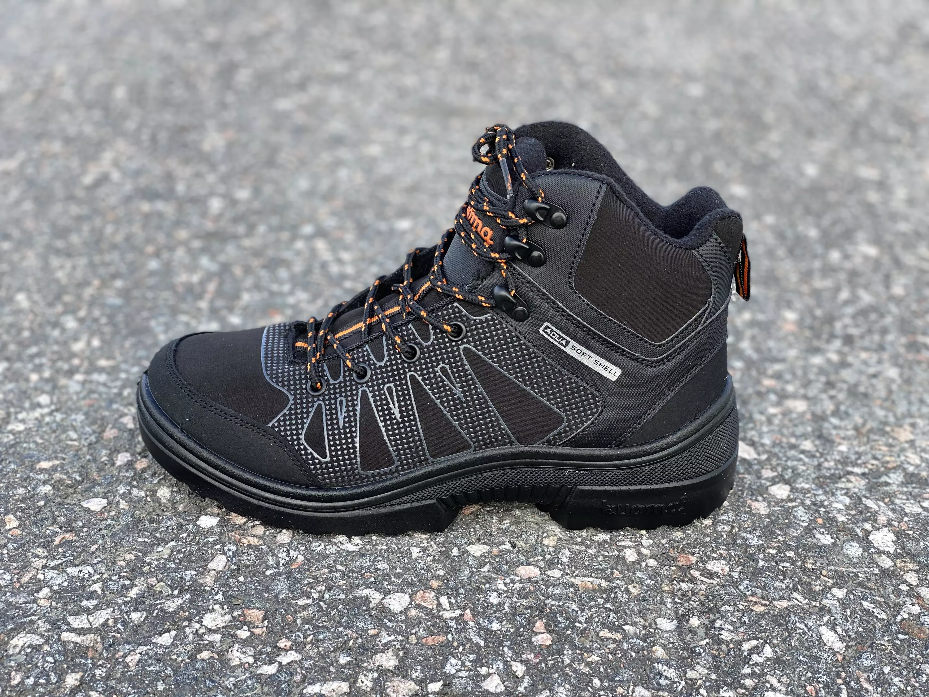 Mustat Kuoma Kari Aqua Softshell talvikengät oranssilla aksenttivärillä. Varsin miehekkäästä nimestään huolimatta nämä ovat unisex-talvikengät. Kosteudenkestävä Softshell pinta. Ulkopohja on joustava ja iskuavaimentava. Irroitettavan pohjallisen tilalle sujahtaa vaivattomasti omaan jalkaasi parhaiten sopiva pohjallinen. Teddyvuori auttaa varpaita pysymään lämpiminä. Tilava lesti, joten varpailla on tilaa.