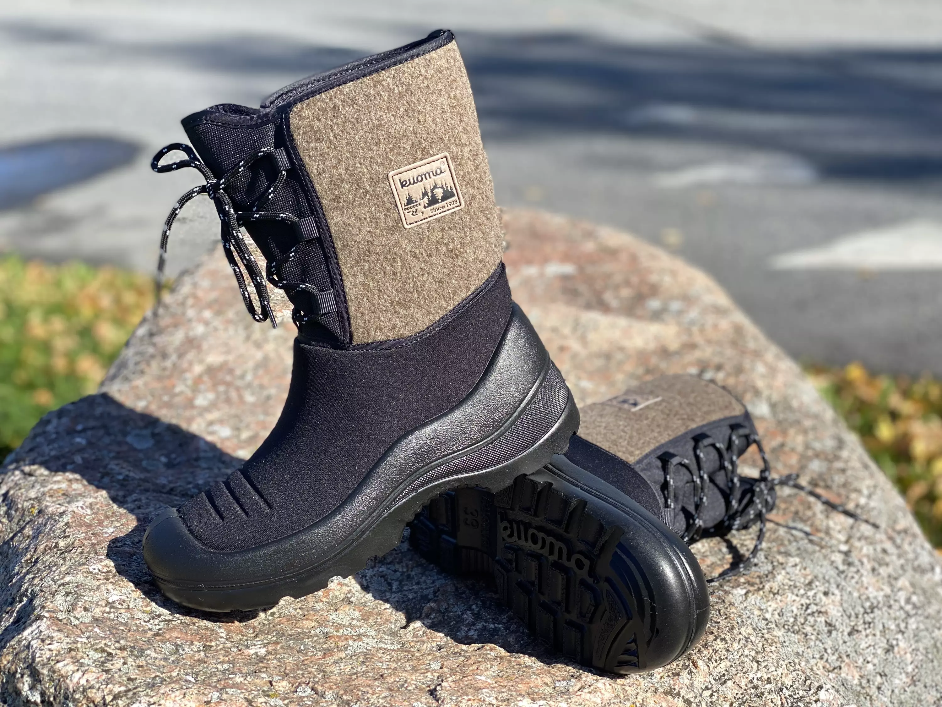 Ruskeat Kuoma Lumitarina talvisaappaat. Ruskealla varrella varustettu Lumitarina on Kuoman uusi heijastavilla nauhoilla kiristettävä reipashenkinen saapas. Varren huopaosa on eläväpintaista PET-kierrätysmateriaalia. Materiaalin valmistamiseen on käytetty mm. muovipulloja ja ylijäämämateriaaleja. Kuoman syntysijan tarinaa kertoo varren merkki koskineen ja metsineen. Jalkineen sisatilavuutta voit säätää helposti KVD-välipohjallisella.