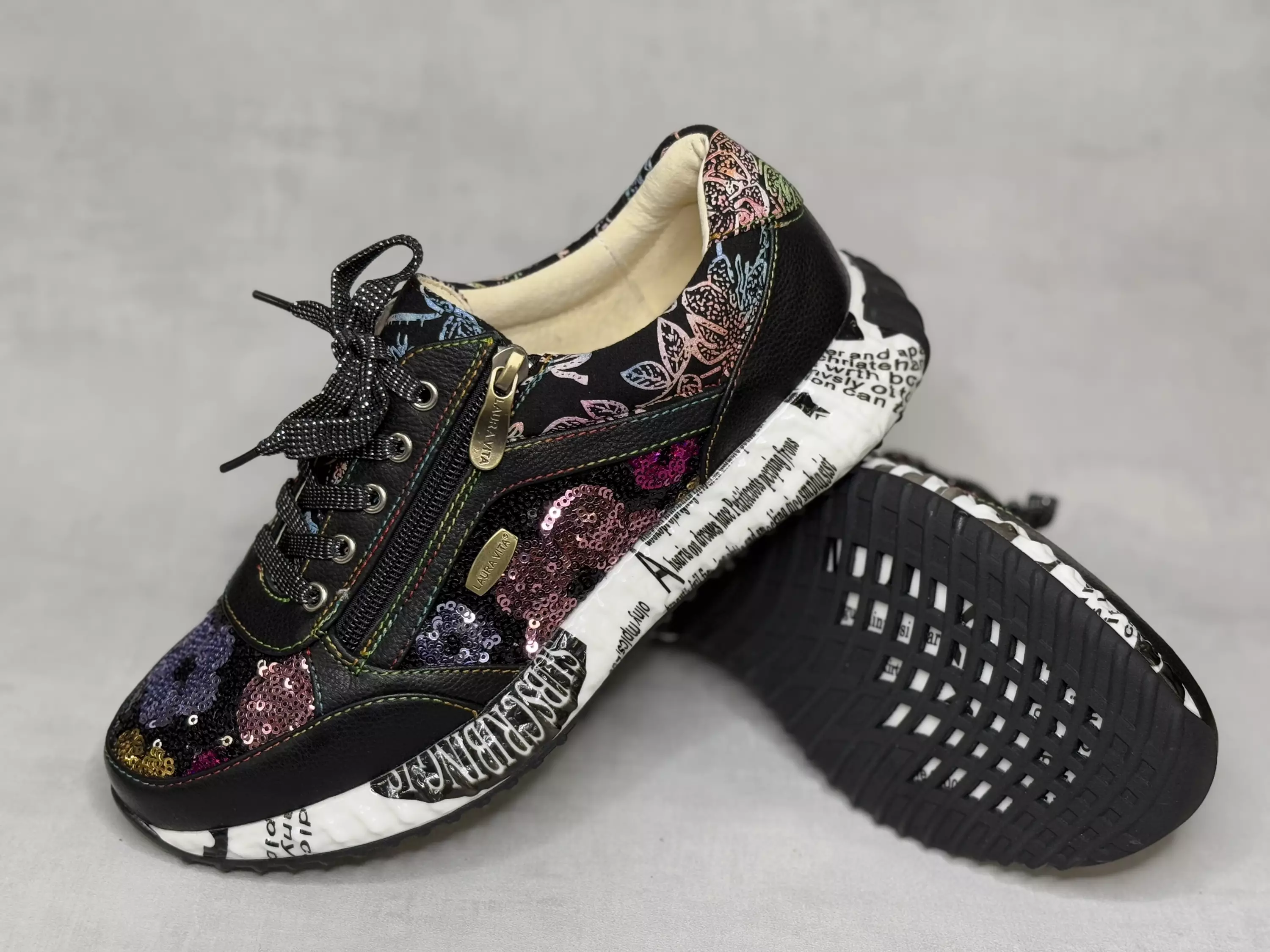 Mustat Laura Vita Burton Dorian lenkkarit. Värikkäät paljetinkimaltavat kukkakuviot kengän kärjessä, sisäsyrjällä ja ulkosyrjällä, pohjavärinä musta paljetti. Iltissä ja varrensuussa vaaleanpunaiset lehtikuvioiset osiot mustalla pohjalla. Musta-hopeiset kengännauhat. Ulkosyrjälle sijoitettu vetoketju helpottaa kenkien pukemista. Sateekaarenkirjavat tikkaukset.