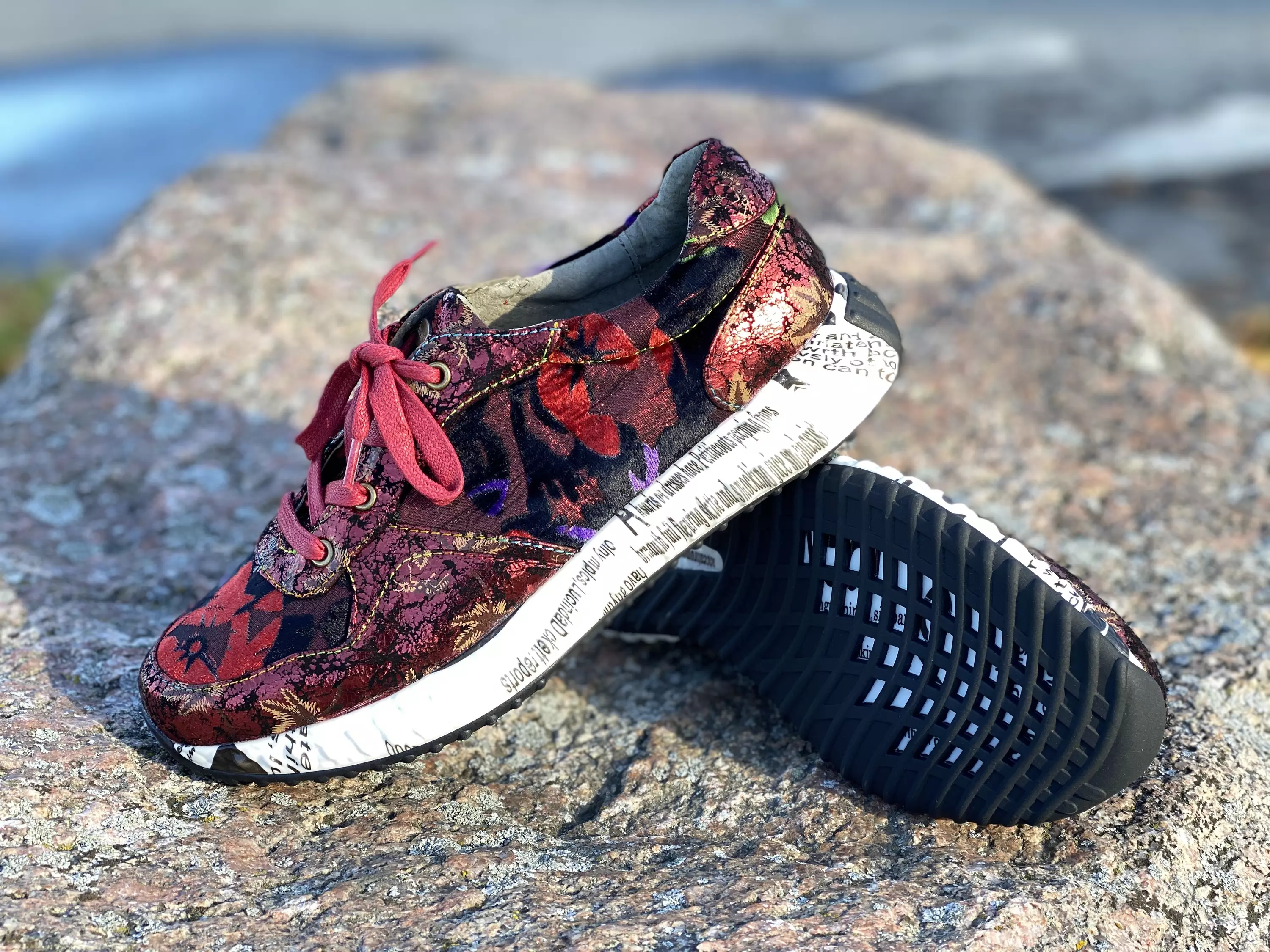Punaiset Laura Vita Burton 45 Rouge lenkkarit. Taktiikka on Laura Vitan tuttuun tyyliin mieluummin överit kuin vajarit. Pinnassa kahta eri kuosia, metallinkimaltava nahkainen lehtikuosi sekä tekstiilipohjainen samettikuosi Tekstiilipohjaisen osion värit vaihtelevat punaisen, vihreän, keltaisen ja mustan sävyissä ja jokainen pari on uniikki! Punaiset kengännauhat. Tikkaukset koreilevat sateenkaaren väreissä. Ulkopohjan reunoissa tekstikoristelu. Vaihdettavat pohjalliset, joten tarpeen vaatiessa vaihdat kenkiin omia tarpeitasi parhaiten vastaavat pohjalliset.