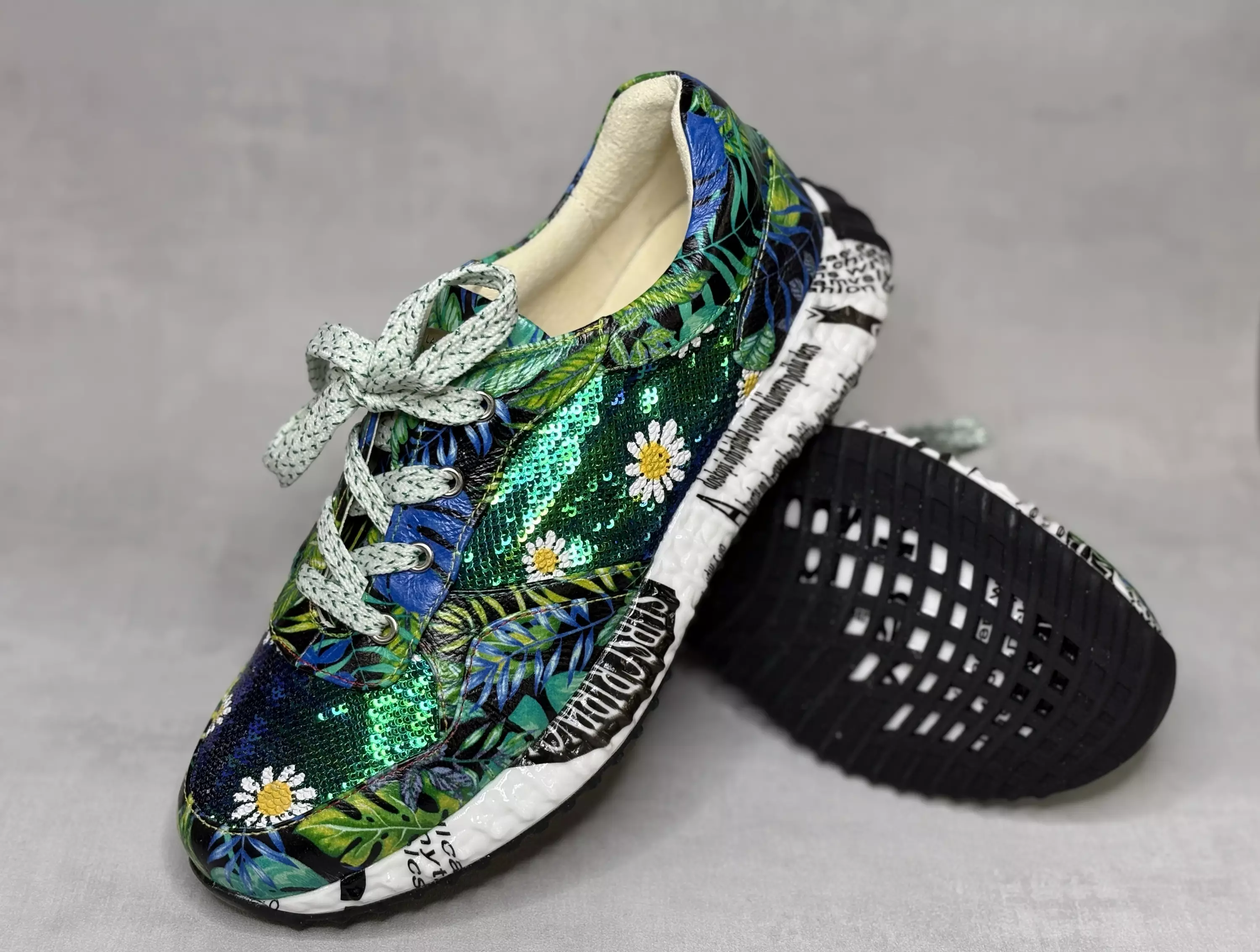 Sini-vihreät moniväriset Laura Vita Burton Vert lenkkarit. Upeasti valoa heijastava sinivihreä paljettipinta, johon on kuvioitu päivänkakkaroita. Valko-vihreät kengännauhat. Nahkaisessa osiossa vihreitä ja sinisiä lehtikuvioita mustalla pohjalla. Valkoiset mustilla teksteillä kuvioidut ulkopohjan sivut. Nahkainen vuori ja nahkapintaiset pohjalliset. Pohjalliset ovat vaihdettavat, joten tarpeen vaatiessa sujautat kenkiin omia tarpeitasi parhaiten vastaavat pohjalliset.