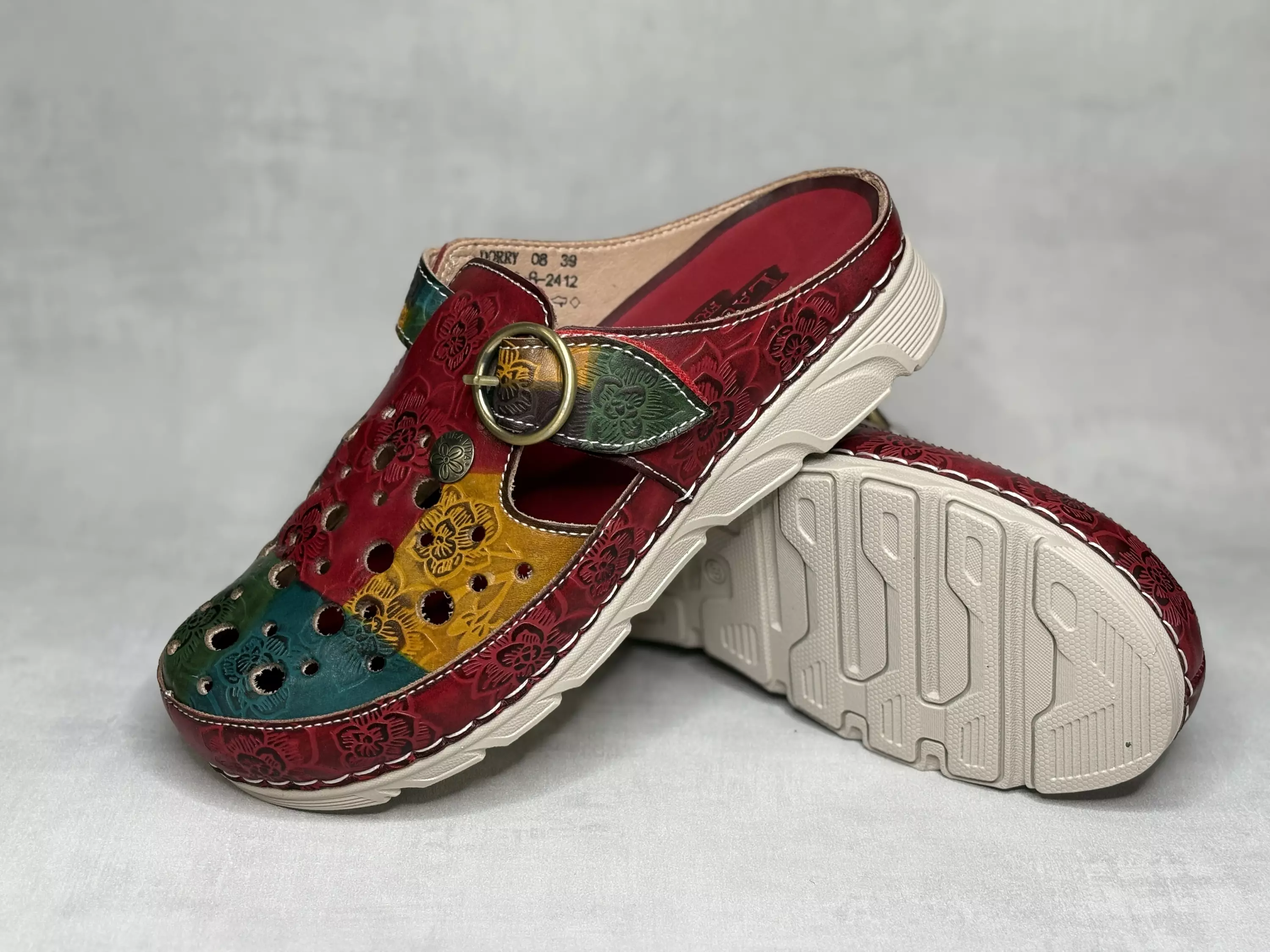 Pääväriltään punaiset Laura Vita Dorry Rouge pistokkaat. Monivärinen kukkakuvioinen pyöreillä rei'illä koristettu kärki ja kukkakuvioinen säätöremmi. Säätöremmi on tarrakiinnitteinen ja siinä on koristeena pyöreä metallinen solki.