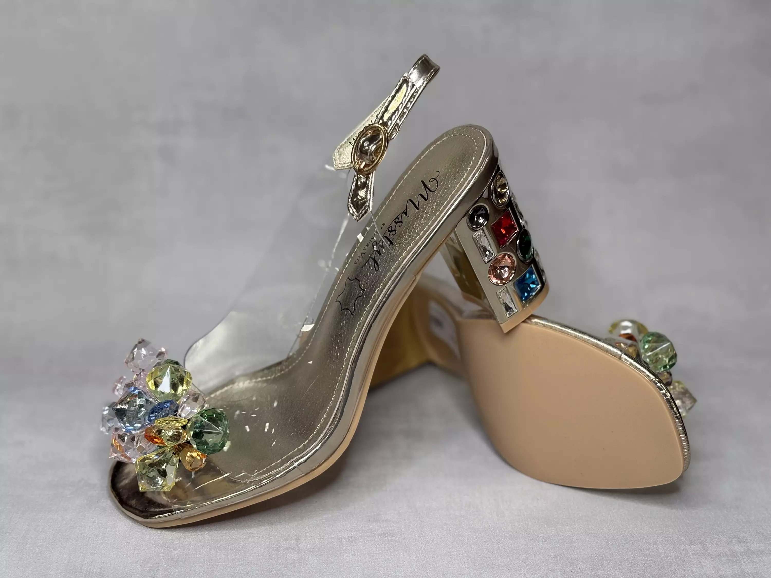 Moniväriset Laura Vita Misstyl Missy Dore sandaalit. Korkeakorkoiset läpinäkyvät sandaalit, joiden kärjessä ja korossa on näyttävät jalokivikoristeet. Kullan värinen kantaremmi ja sisäpohja.