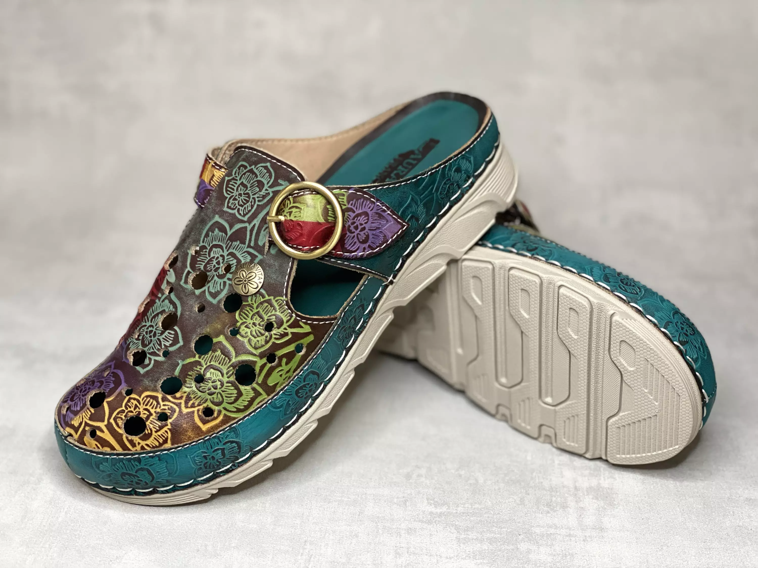 Turkoosit Laura Vita Dorry pistokkaat. Monivärinen kukkakuvioinen reikäkuvioitu kärki ja kukkakuvioinen säätöremmi. Säätöremmi on tarrakiinnitteinen ja siinä on koristeena pyöreä metallinen solki.