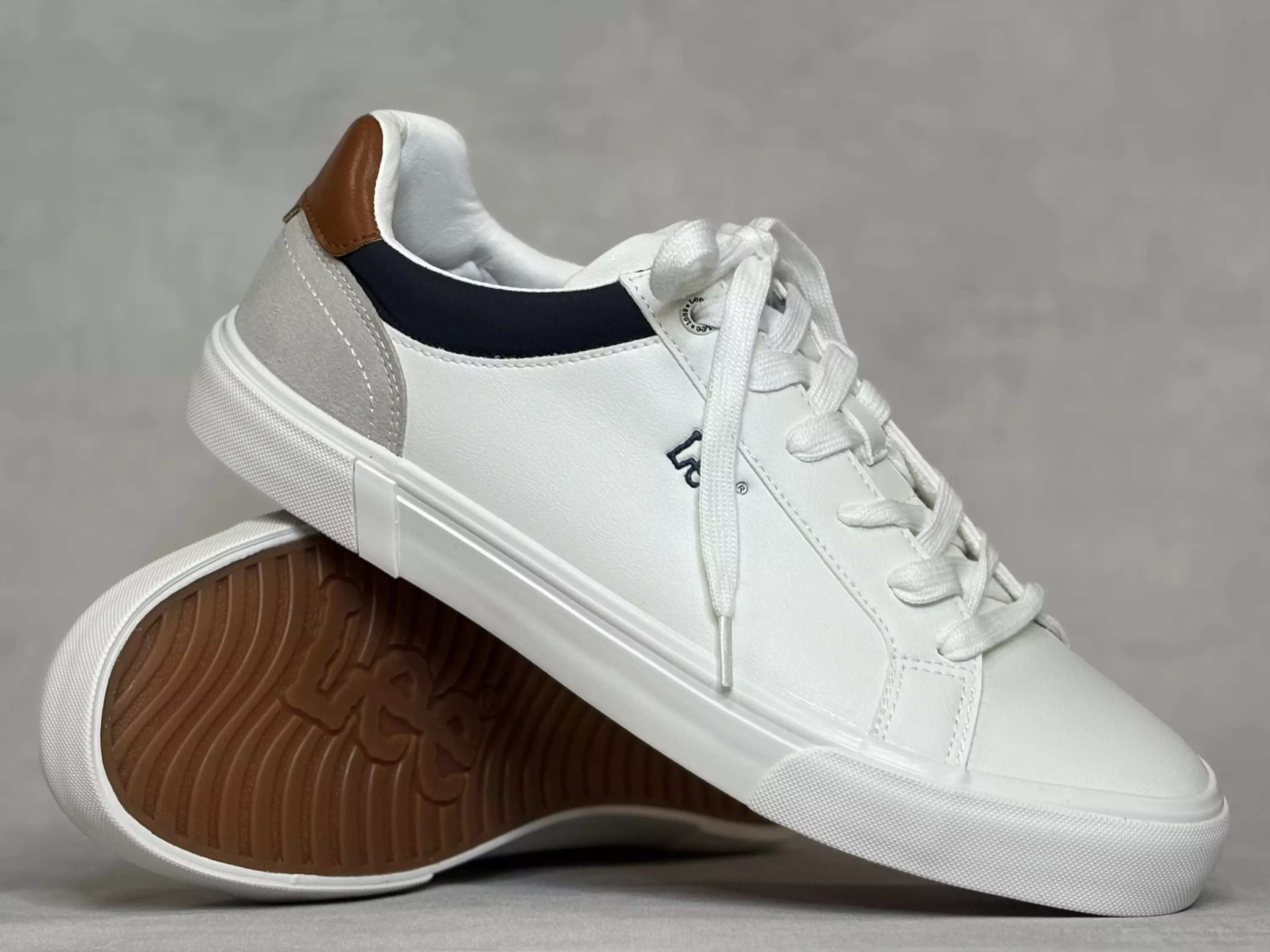 Valkoiset matalavartiset Lee Brixton tennarit. Valkoiset matalavartiset tennarit ruskeilla, harmailla ja tummansinisillä yksityiskohdilla. Nauhojen avulla kengät säätyvät jalkaan sopiviksi. Kapeahko/Normaali lesti, mutta koot ovat noin puoli numeroa pienempää mitoitusta. Kannan korkeus noin 2cm ja pohjan korkeus päkiän alta noin 1,5cm.