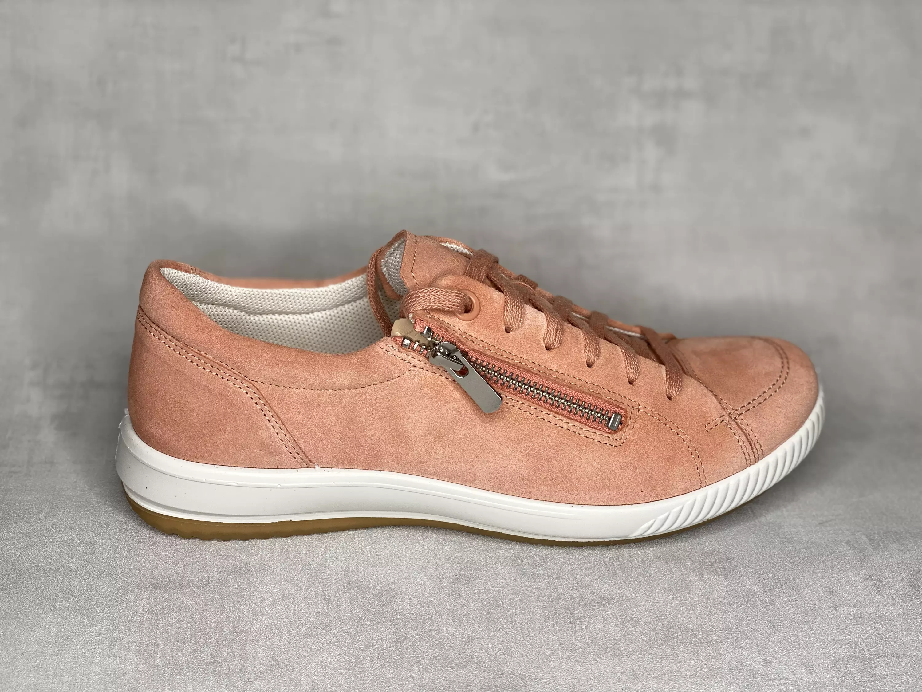 Persikkaisen punaoranssit Legero Carnelian rot kävelykengät / citytennarit, joiden tikkaukset on ommeltu pintaan mätsäävällä langalla. Ulkosyrjällä pukemista helpottava vetoketju, joten voit säätää nauhat vain kerran ja pukea kengät sen jälkeen jalkaan pelkän vetoketjun avulla. Pohjan reuna on valkoinen ja ulkopohja itsessään vaalean ruskea. Pehmeät, vaihdettavissa olevat pohjalliset, joten kenkään sujahtaa tarpeen vaatiessa omaan jalkaasi parhaiten sopivat pohjalliset.