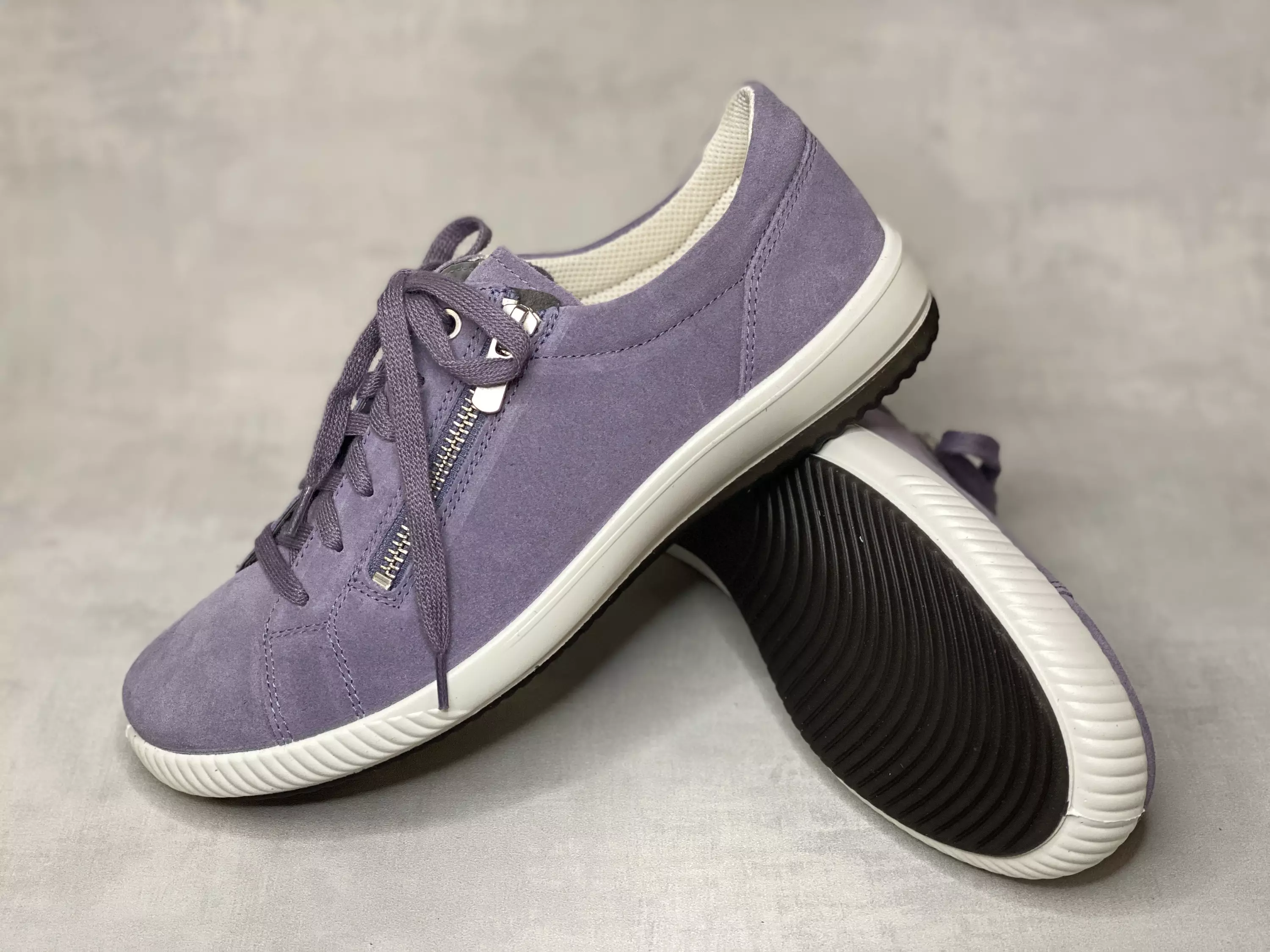 Laventelin liilat Legero Ridge kävelykengät / citytennarit, joiden tikkaukset on ommeltu pintaan mätsäävällä langalla. Ulkosyrjällä pukemista helpottava vetoketju, joten voit säätää nauhat vain kerran ja pukea kengät sen jälkeen jalkaan pelkän vetoketjun avulla. Nauhoituksen ylimmässä reikäparissa metallinväriset sirkkarenkaat. Pohjan reuna on valkoinen ja ulkopohja tummanharmaa. Pehmeät, vaihdettavissa olevat pohjalliset, joten kenkään sujahtaa tarpeen vaatiessa omaan jalkaasi parhaiten sopivat pohjalliset.