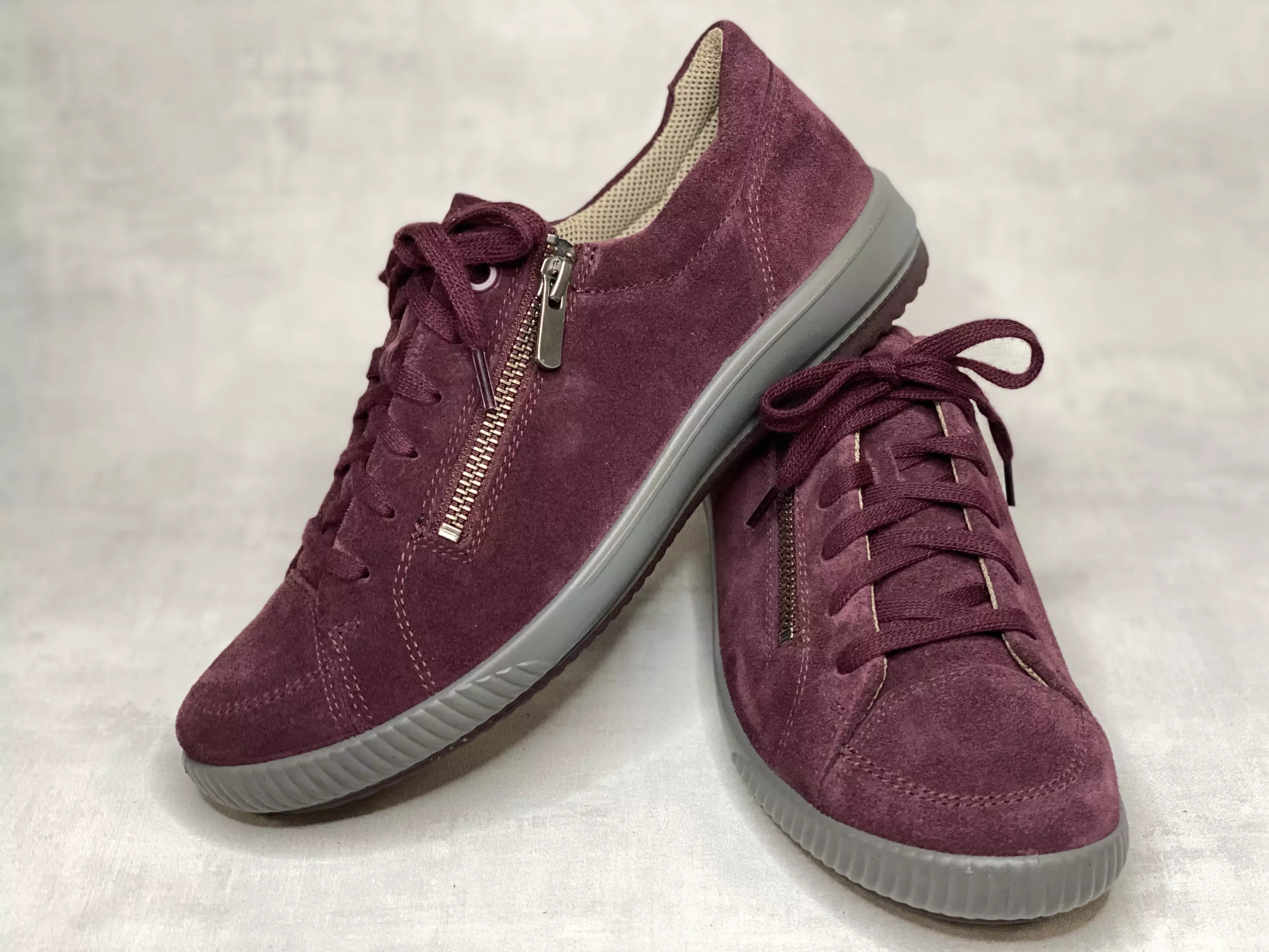 Ruskeanpunaiset Legero Tanaro 5.0 Ruby kävelykengät / citytennarit, joiden tikkaukset on ommeltu pintaan mätsäävällä langalla. Ulkosyrjällä pukemista helpottava vetoketju, joten voit säätää nauhat vain kerran ja pukea kengät sen jälkeen jalkaan pelkän vetoketjun avulla. Pohjan reuna on harmaa ja ulkopohja itsessään viininpunainen. Pehmeät, vaihdettaviat olevat pohjalliset, joten kenkään sujahtaa tarpeen vaatiessa omaan jalkaasi parhaiten sopivat pohjalliset.