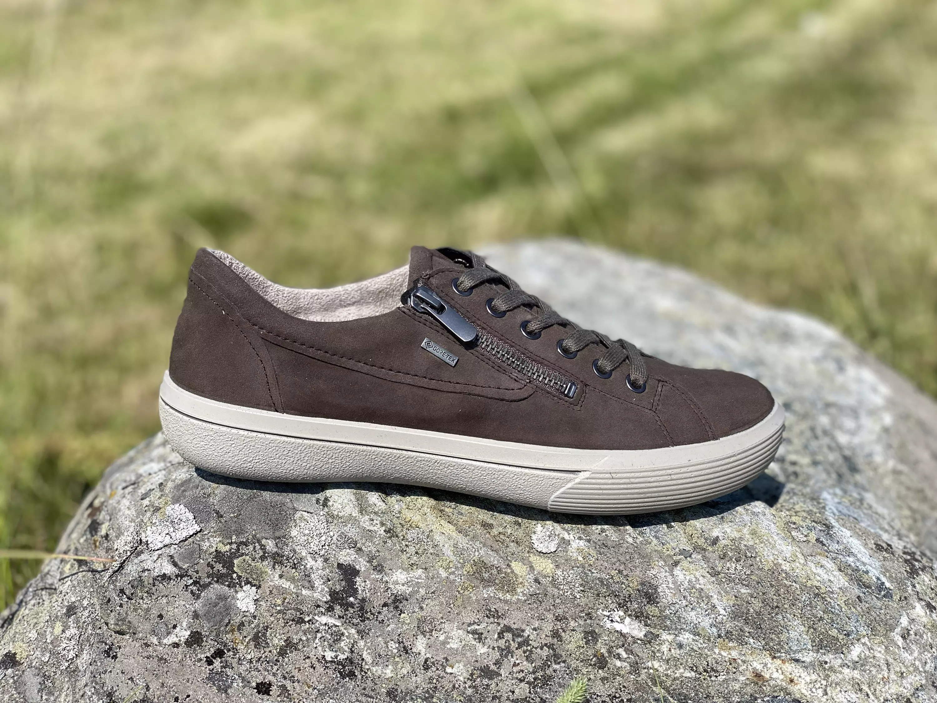 Ruskeaan taittavat tummanharmaat Legero GoreTex citylenkkarit. Legerolle tuttuun tyyliin tässäkin citytennarissa on ulkosyrjällä pukemista helpottava vetoketju sekä nauhat, joilla kenkä säätyy sopivaksi juuri sinun jalkaasi. Vaihdettavat pohjalliset, joiden tilalle sujahtaa tarvittaessa omaan jalkaasi parhaiten sopivat pohjalliset.