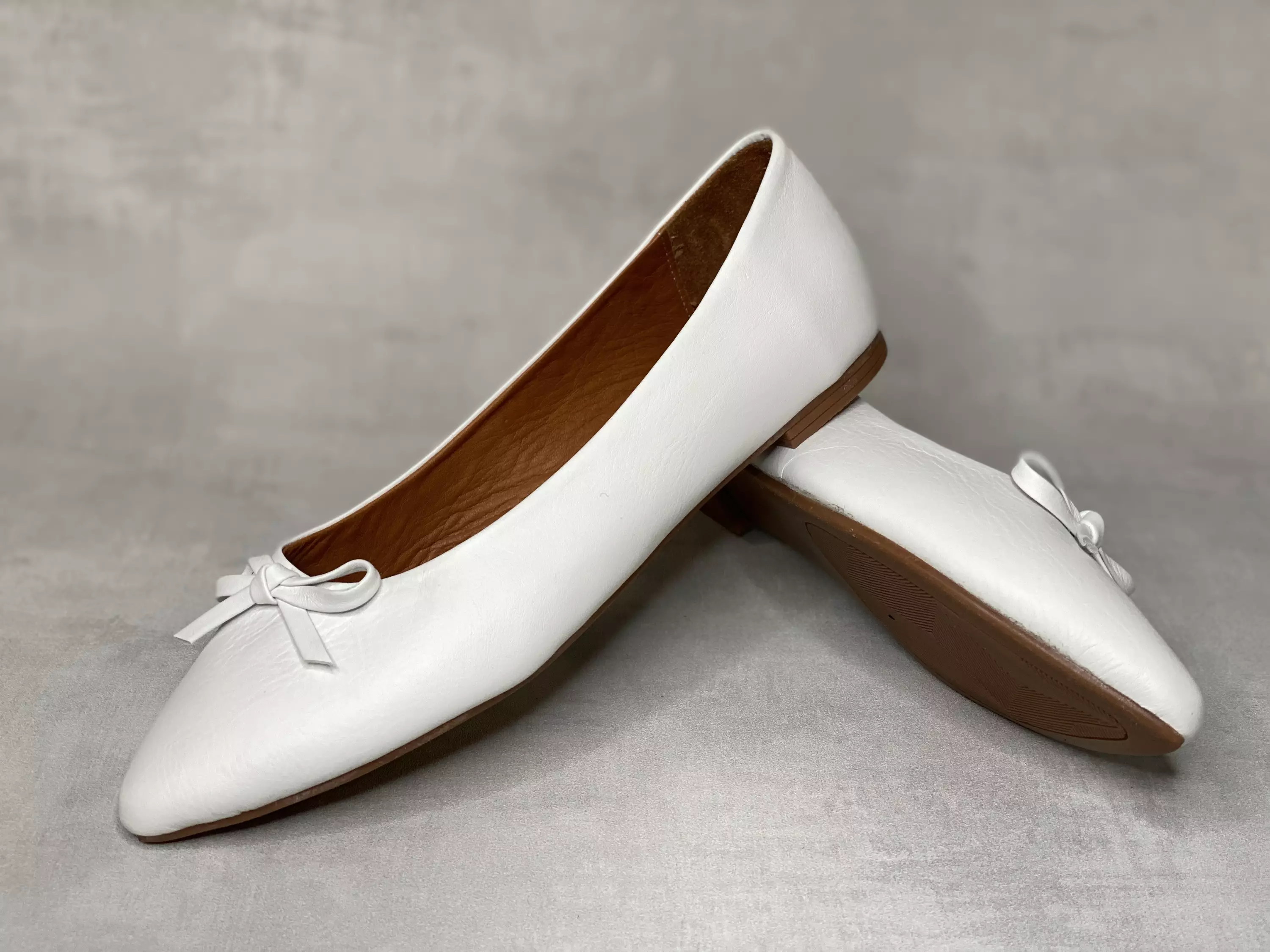 Valkoiset MAGO ballerinat. Rusettikoristeiset pehmeästä nahasta valmistetut ballerinat ovat jalkaan mukautuva valinta. Tyylikäs terävä kärki. Näissä ballerinoissa myös vuorit ovat nahkaa.