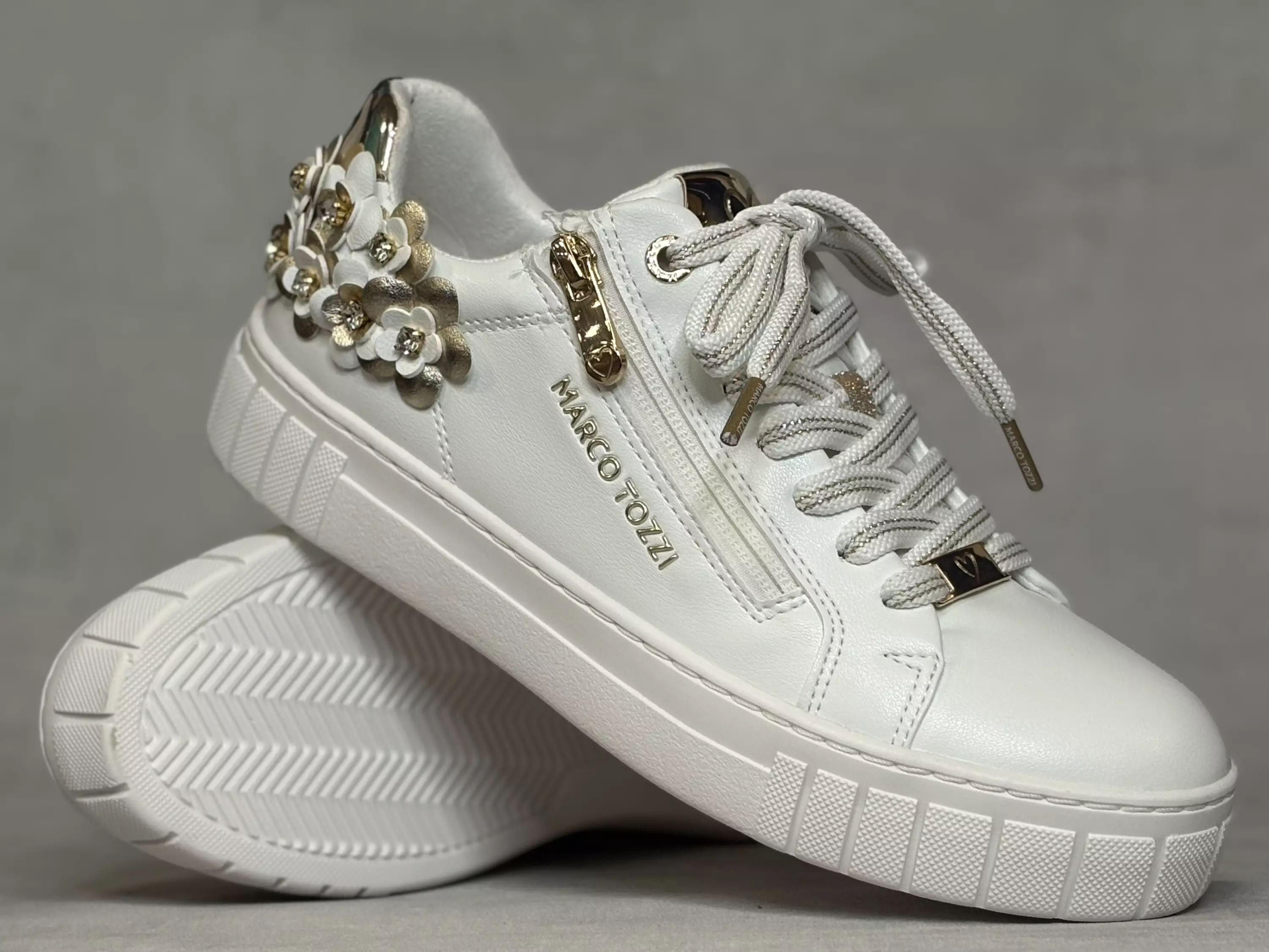 Valkoiset Marco Tozzi kävelykengät. Sievillä valkoisilla ja kultaisilla kukilla koristettu kantaosa, kukkien keskellä koristekivet. Valko-kultaiset kengännauhat ja pukemista vauhdittava vetoketju. Vetoketjussa kullan värinen vedin ja kengän ulkosyrjällä kultainen Marco Tozzi-logo. Kullan värinen kantakappale, jossa Marco Tozzi sydänlogo. Vaihdettavat pohjalliset, joten tarvittaessa sujautat kenkiin omia tarpeitasi parhaiten vastaavat pohjalliset. Lestimitoitus normaali G. Kannan korkeus noin 3,5cm ja pohjan korkeus päkiän alta noin 2cm.