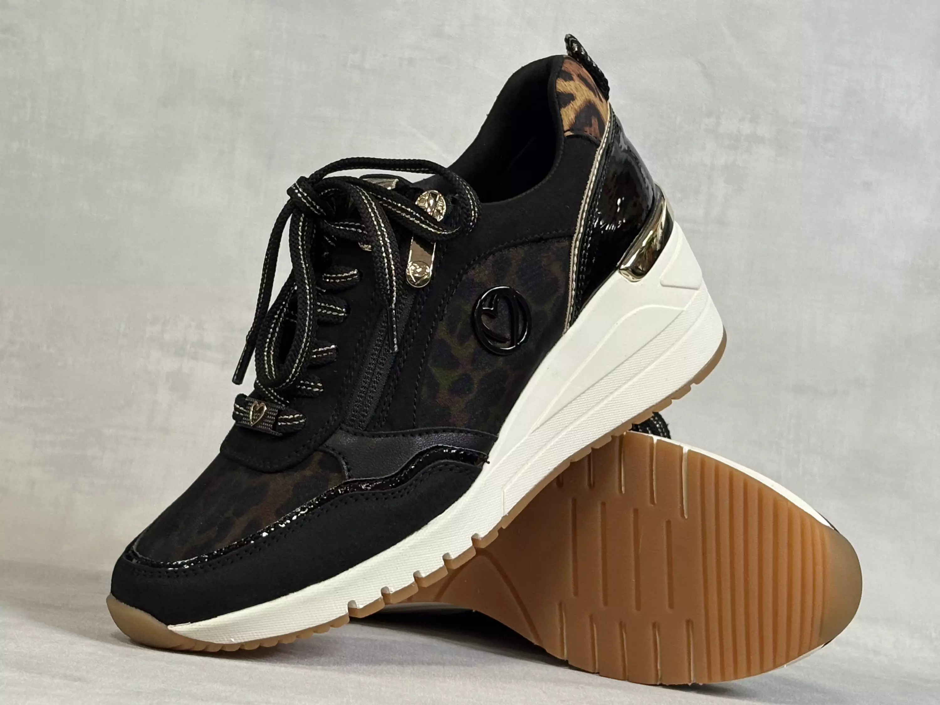 Mustat kiilapohjaiset Marco Tozzi kävelykengät leopardikuosisilla yksityiskohdilla