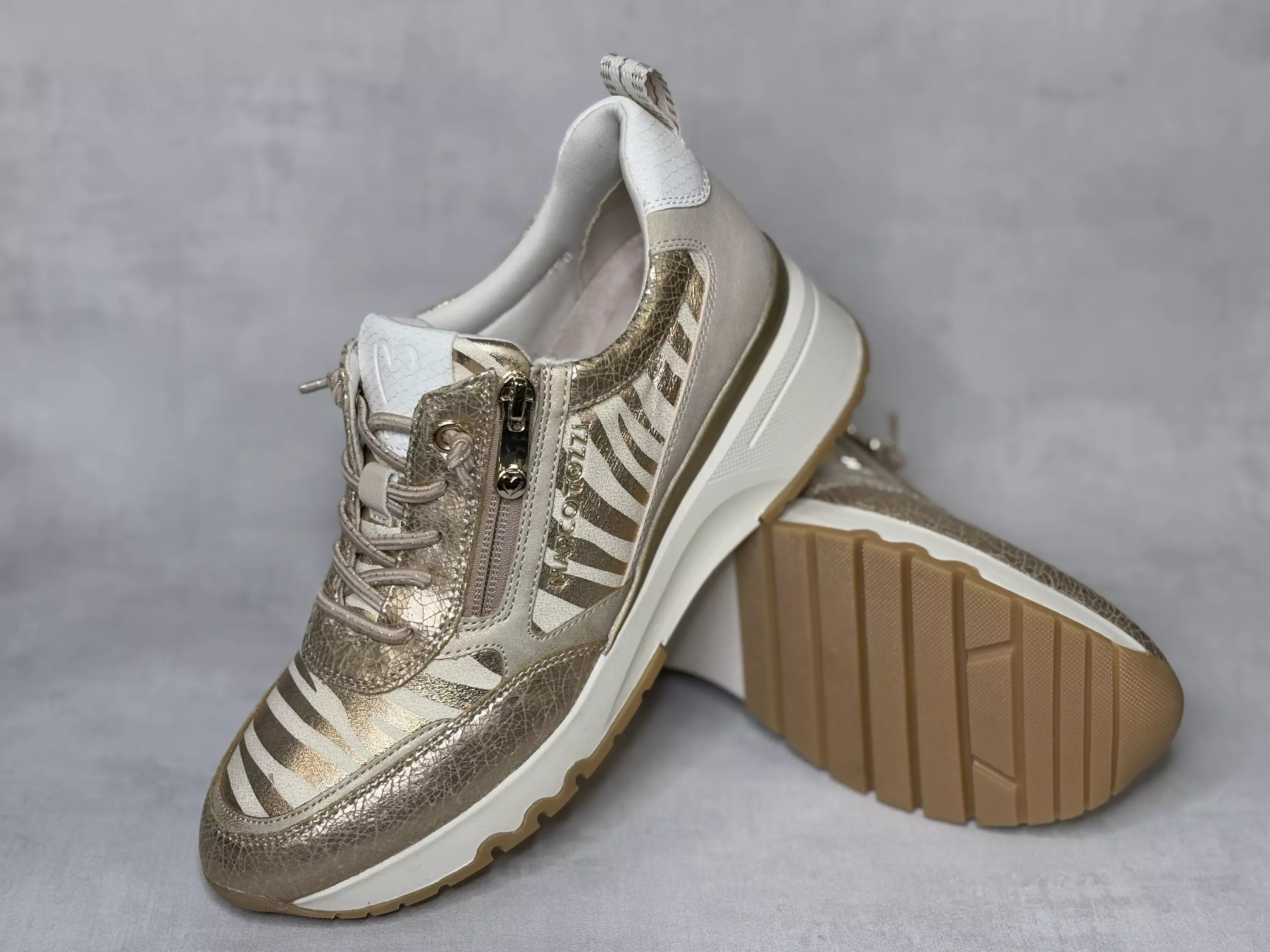 Beige - kultaiset Marco Tozzi citylenkkarit. Kiilapohjaiset kävelykengät ovat saaneet koristuksekseen muodin aallonharjalla surffaavan kullanhohtoisen seeprakuosin. Ulkosyrjällä pukemista vauhdittava vetoketju. Beiget venykenauhat kullanhohtoisilla hipuilla. Kärjessä, venykenauhoituksen ympärillä ja ulkosivussa kullan väriset osiot, joissa upea halkeilua imitoiva pinta. Valkoisessa iltissä ja kantakappaleessa matelijamaiset suomukuviot. Vaihdettavat pohjalliset, eli tarvittaessa sujautat kenkiin vaivattomasti omia tarpeitasiparhaiten vastaavat pohjalliset. Kiilapohjan korkeus noin 4,5cm, pohjan korkeus päkiän alta noin 2cm.