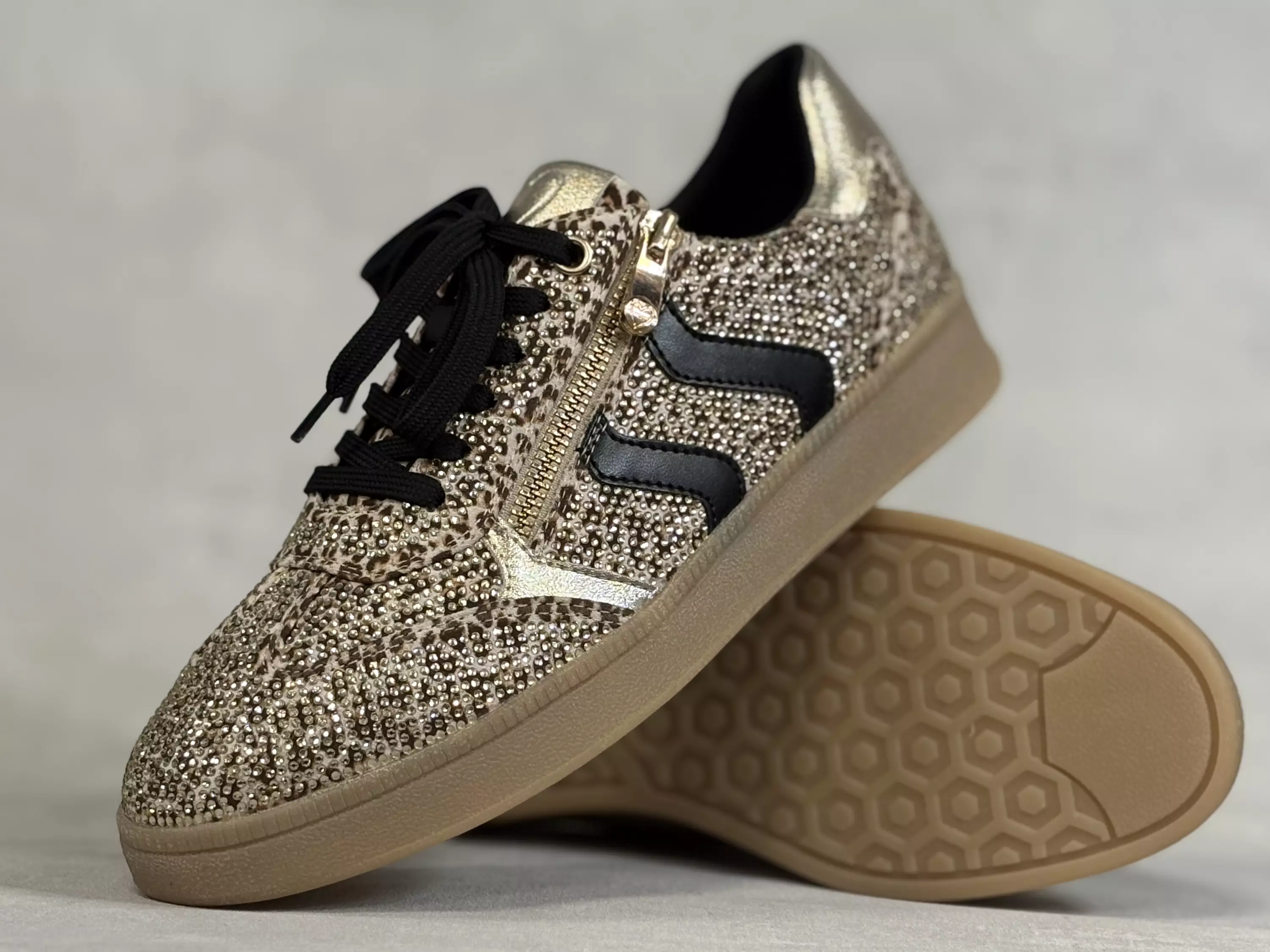 Leopardikuvioiset Marco Tozzi Leo Dune Comb kävelykengät. Näyttävä strassikuvioitu pinta, joka heijastaa upeasti valoa. Aksenttivärinä mustaa ulkosyrjällä ja kengännauhoissa, sekä kultaa pukemista vauhdittavassa vetoketjussa ja kantakappaleessa. Muotoillut pohjalliset ovat vaihdettavat, joten tarvittaessa sujautat kenkiin omia tarpeitasi parhaiten vastaavat pohjalliset. Kannan korkeus noin 3cm ja pohjan korkeus päkiän alta noin 1,5cm.