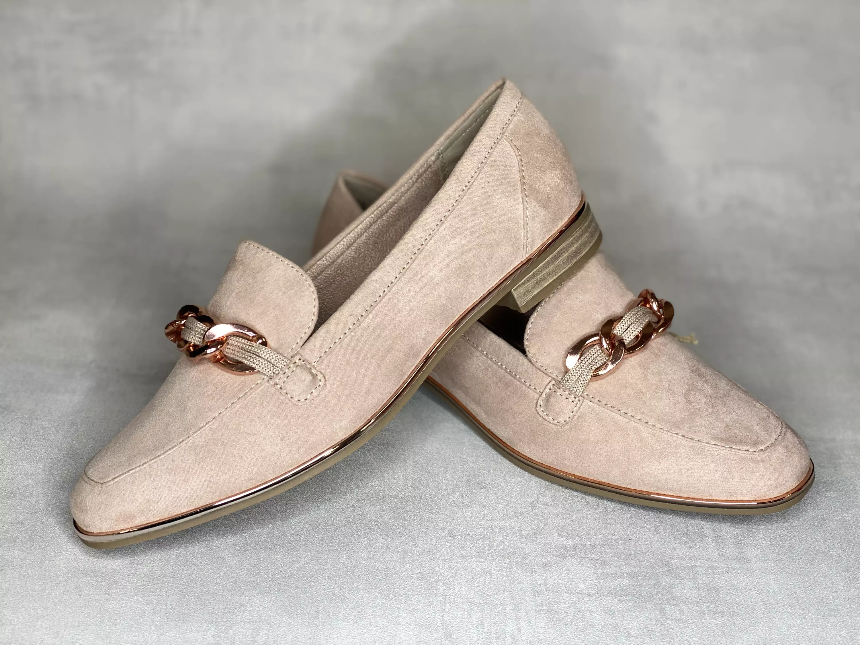 Puuterin beiget Marco Tozzi loaferit ruusukultaisella ketjukoristeella