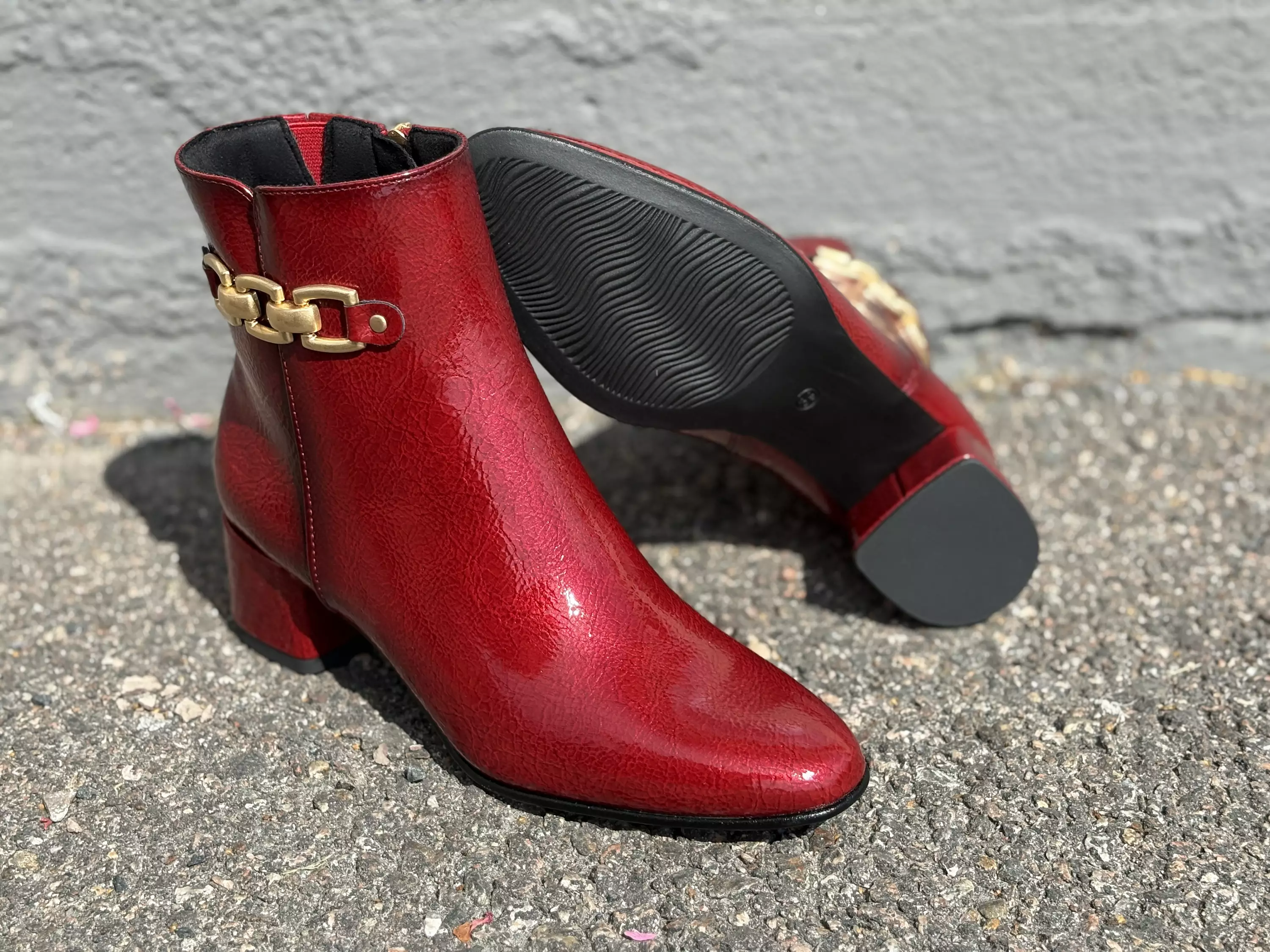 Punaiset Marco Tozzi nilkkurit. Tyylikkäällä kapenevalla kärjellä varustetut lakerinkiiltoiset nilkkurit. Ulkosyrjällä kullan värinen koristeketju. Sisäsyrjälle sijoitetussa pukemista helpottavassa vetoketjussa on kullan värinen vedin. Sisäsyrjällä vetoketjun vieressä pieni istuvuutta parantava venyke. Matalakorkoiset nilkkurit, joiden kannan korkeus on noin 4,5cm ja pohjan korkeus päkiän alta noin 0,5cm.