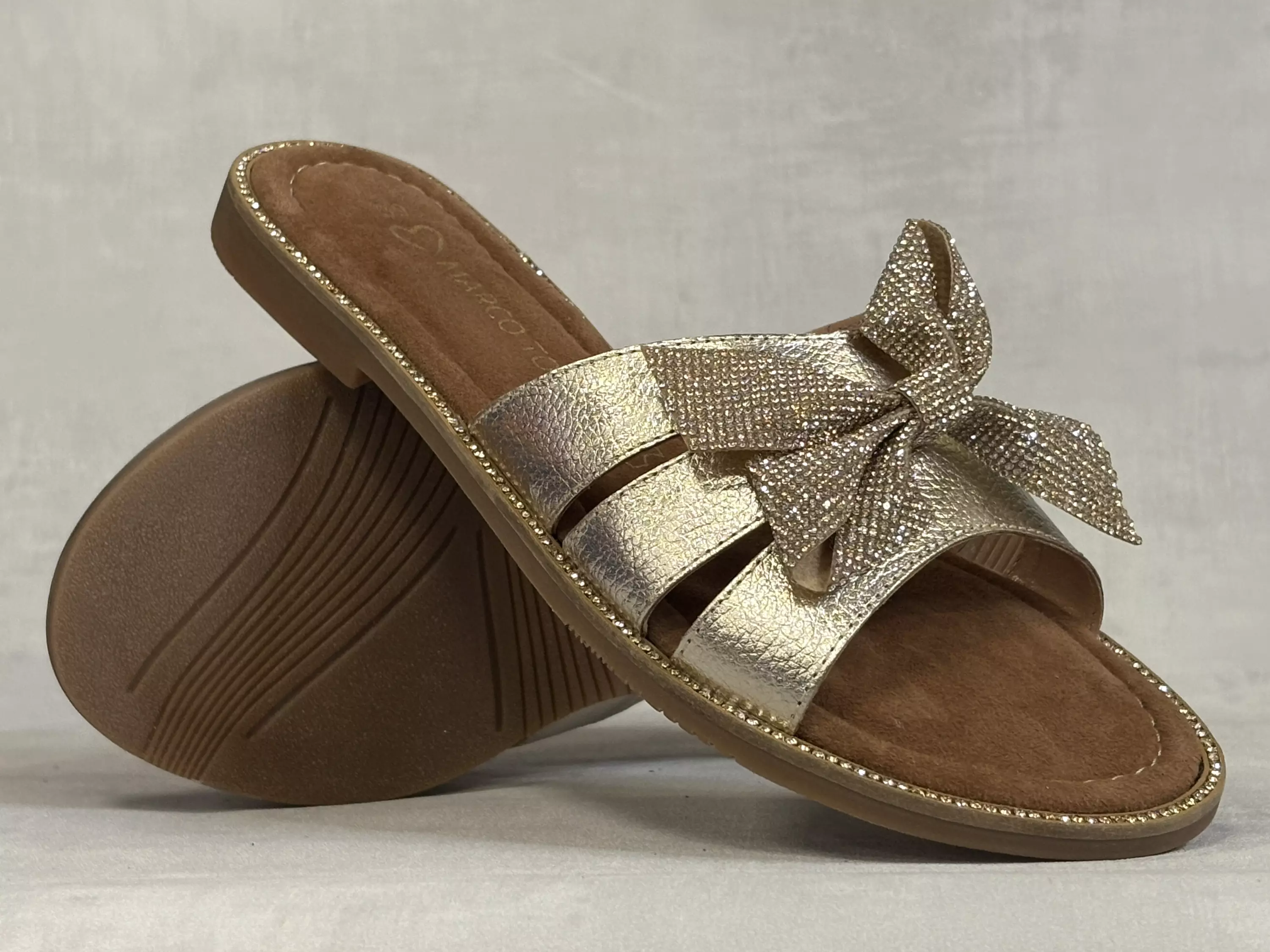 Kultaiset strassikoristeiset Marco Tozzi rusettisandaalit