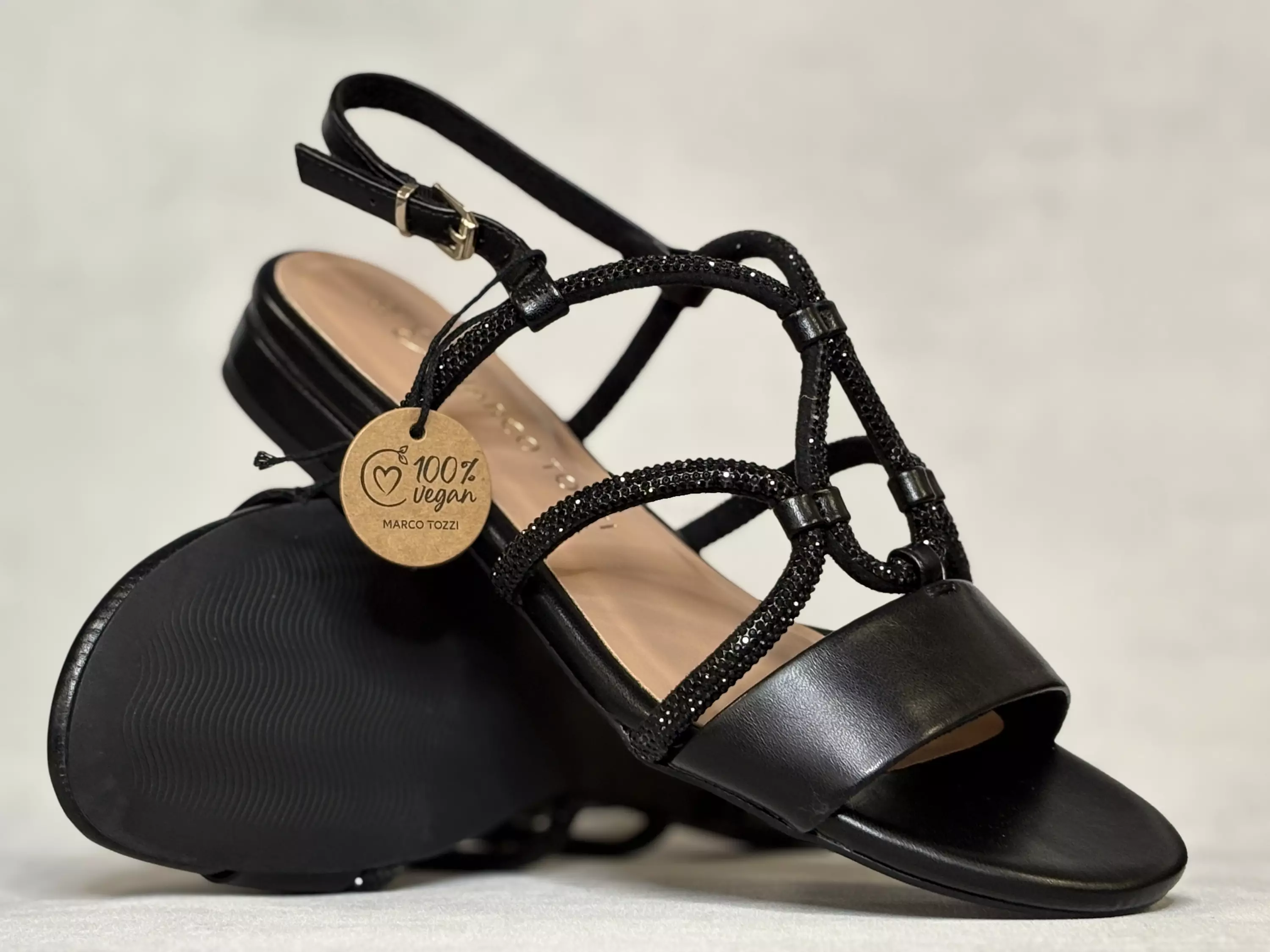 Mustat Marco Tozzi sandaalit. Strassikoristeiset matalakorkoiset sandaalit. Kullan värisellä soljella säädettävä kantaremmi. Lestimitoitus normaali (G). Kannan korkeus noin 3cm ja pohjan korkeus päkiän alta noin 1cm.