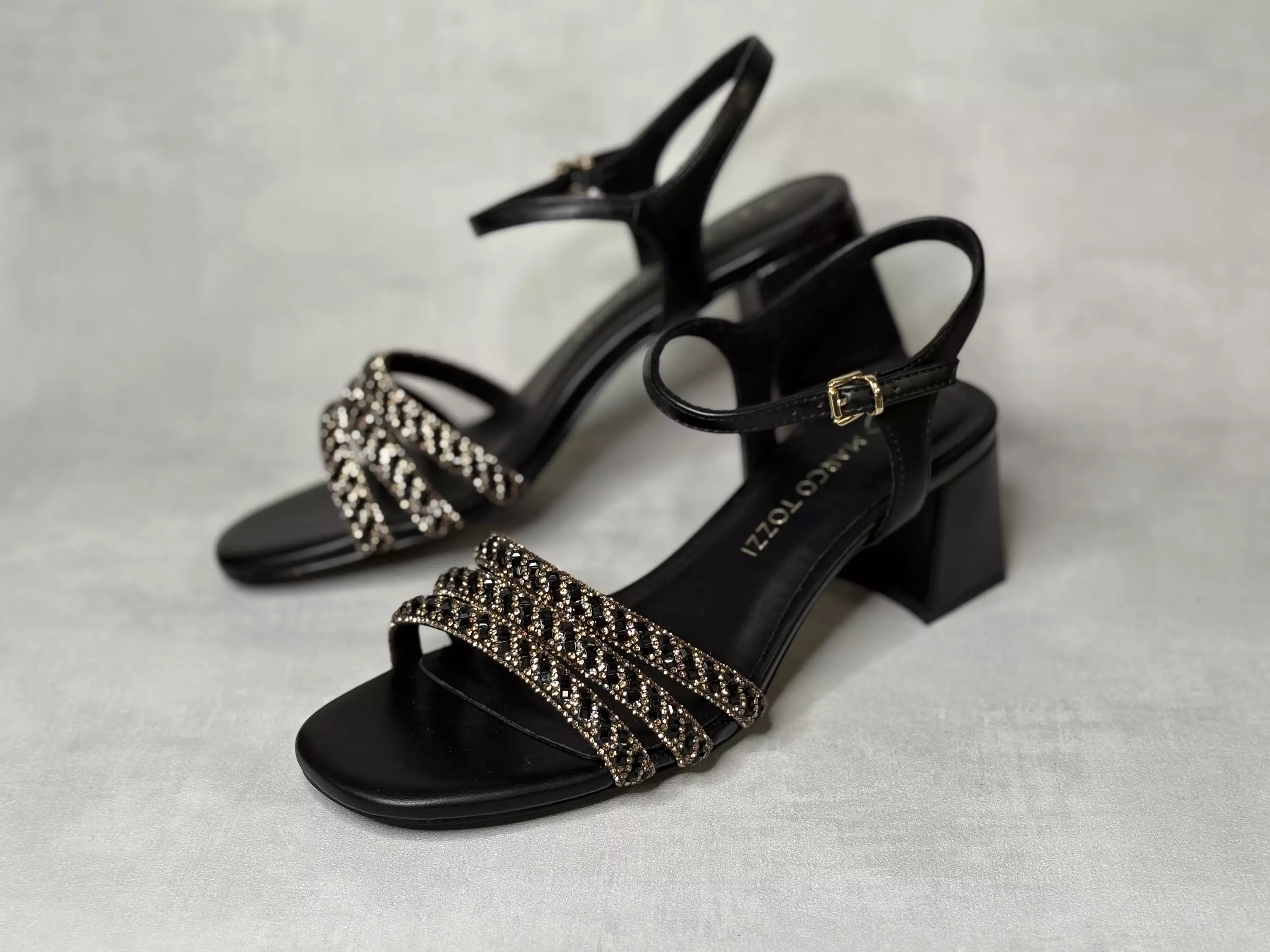 Mustat Marco Tozzi juhlasandaalit. Ihanat strassiremmilliset sandaletit. Korolliset siroilla remmeillä varustetut sandaalit ovat mainio valinta juhlakengäksi. Strassiremmit ovat yhdistelmä kimaltavaa mustaa ja tummaa kultaa. Soljellinen nilkkaremmi. Soljen alla on pieni istuvuutta parantava venyke. Kannan korkeus noin 6cm ja pohjan korkeus päkiän alta noin 1cm.