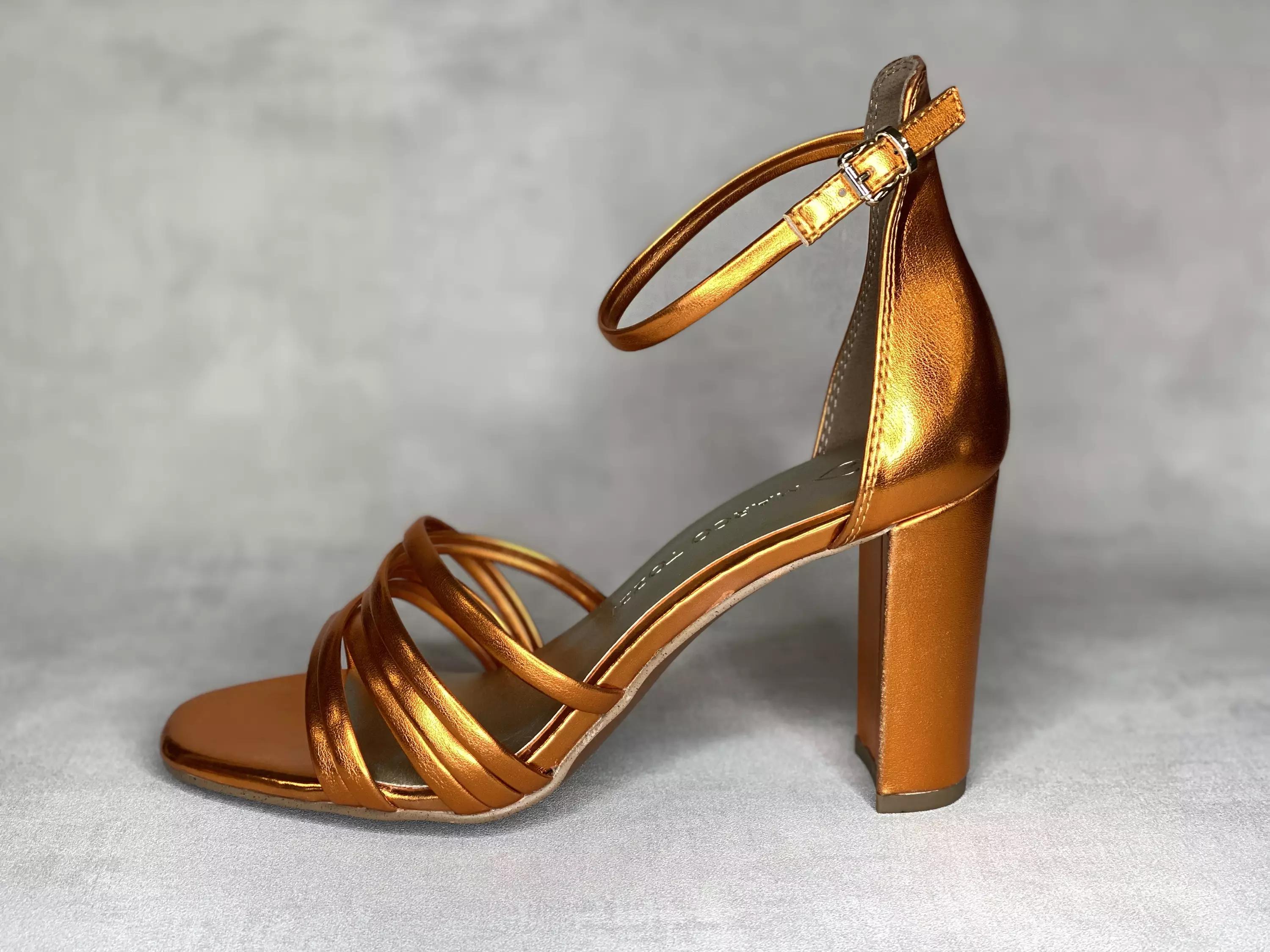 Metallinhohtoiset oranssit Marco Tozzi sandaalit korkeilla koroilla ja nilkkaremmillä