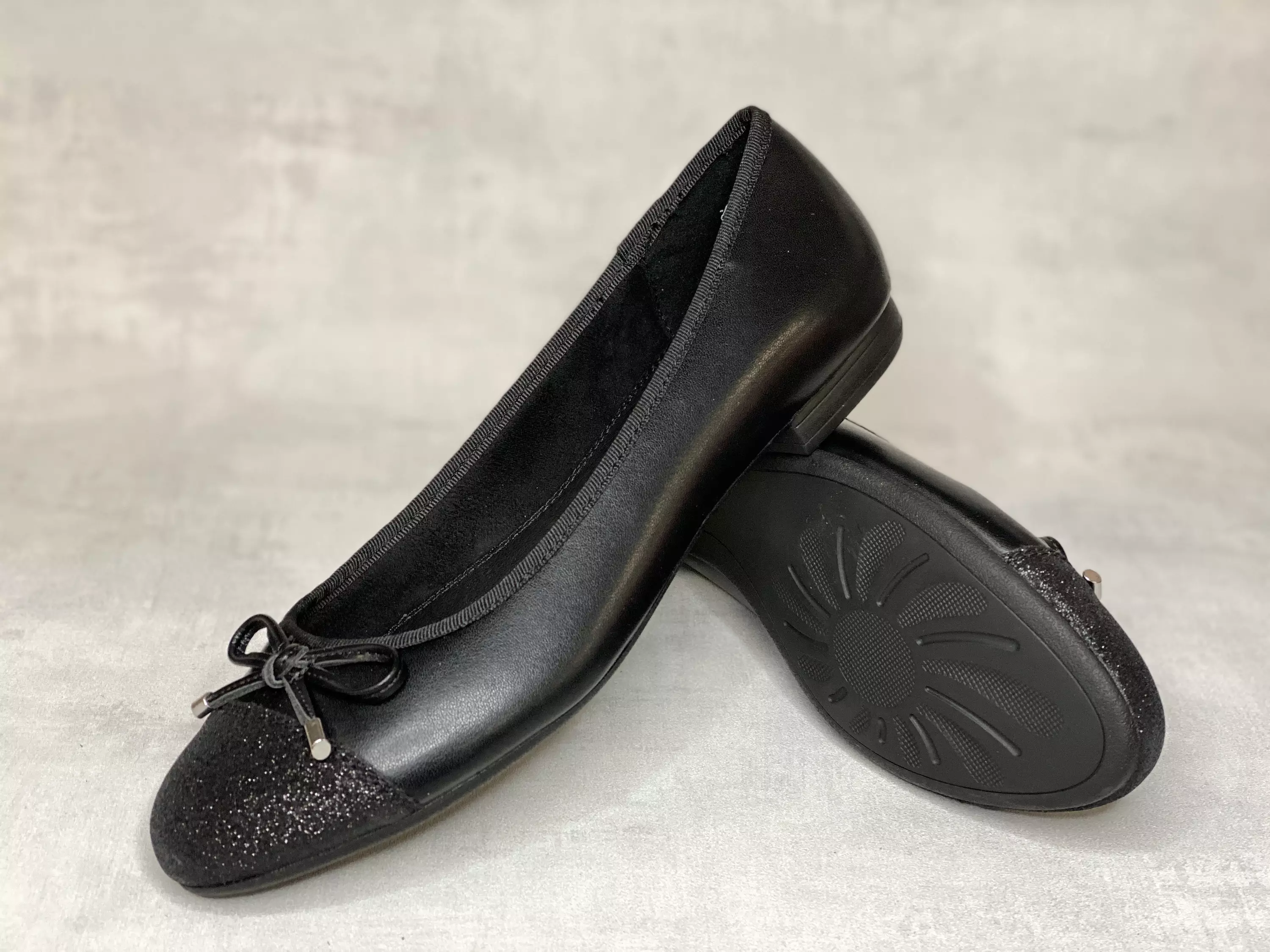 Mustat Marco Tozzi by Guido Maria Kretschmer ballerinat. Sievä koristerusetti ja kimaltava kärki antavat perinteiselle ballerinalle juhlavaa ilmettä. Pehmeä tekstiilivuori. Sisäpohjan pintamateriaali on nahkaa.