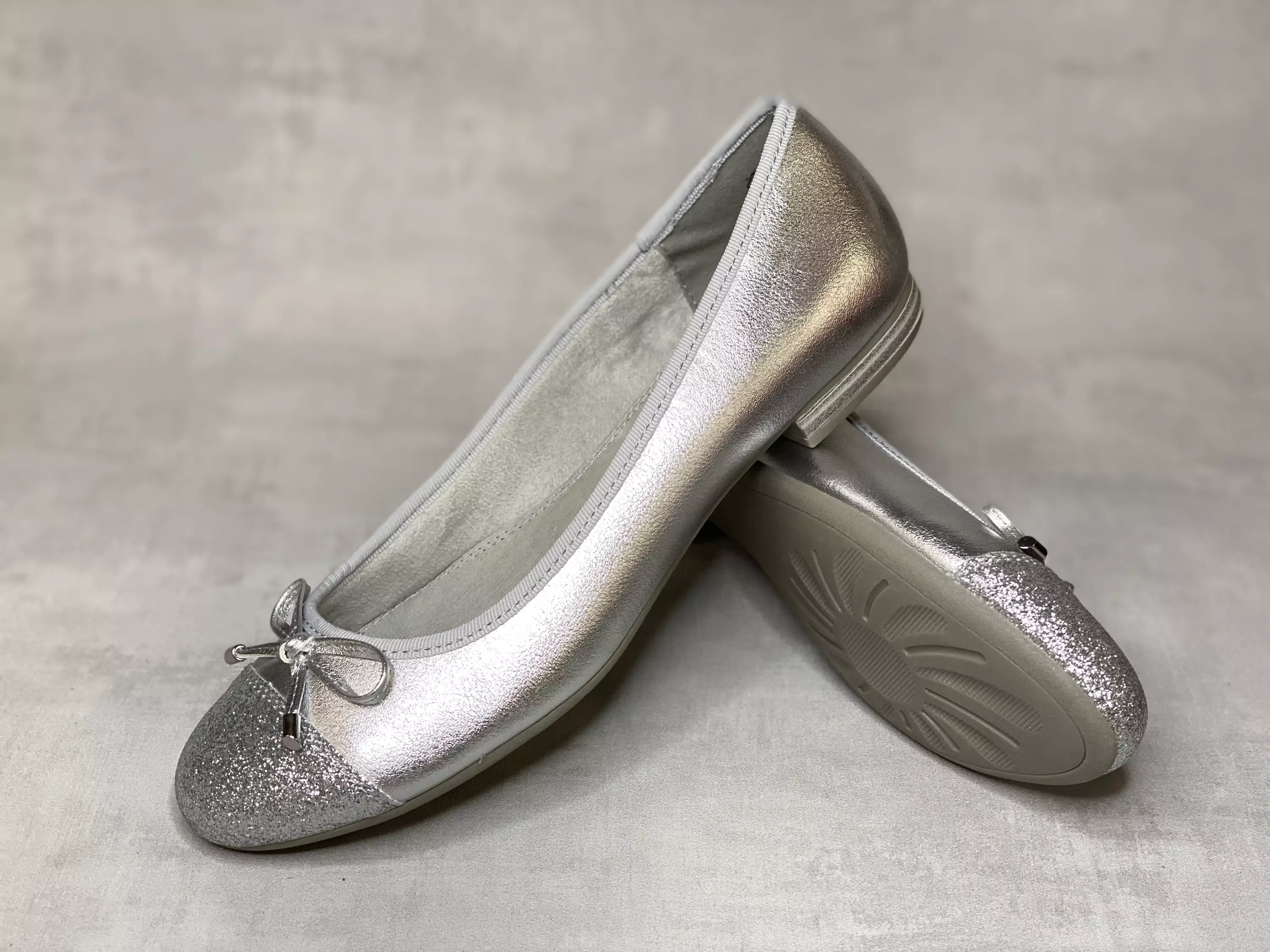 Hopeiset Marco Tozzi by Guido Maria Kretschmer ballerinat. Sievä koristerusetti ja glitterinkimaltava kärki antavat perinteiselle ballerinalle juhlavaa ilmettä. Pehmeä tekstiilivuori. Sisäpohjan pintamateriaali on nahkaa.