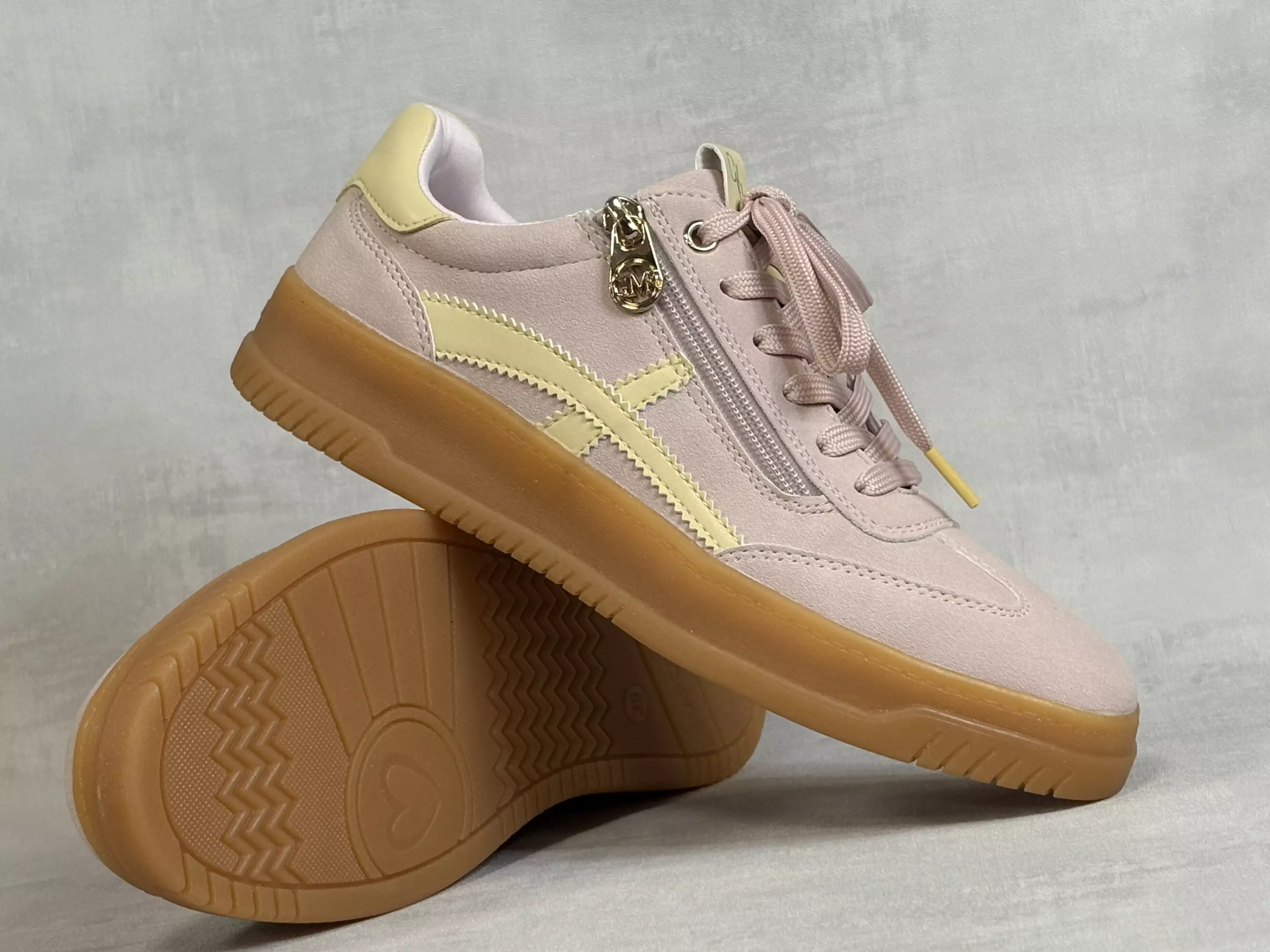 Vaaleanpunaiset Marco Tozzi x Guido Maria Kretschmer kävelykengät. Vaaleankeltaiset yksityiskohdat. Nauhat ja ulkosyrjälle sijoitettu vetoketju kullan värisellä vetimellä. Vaihdettavat pohjalliset, joten tarvittaessa sujautat kenkiin helposti omia tarpeitasi parhaitenv astaavat pohjalliset. Lestimitoitus normaali G. Kannan korkeus noin 3cm ja pohjan korkeus päkiän alta noin 2cm.