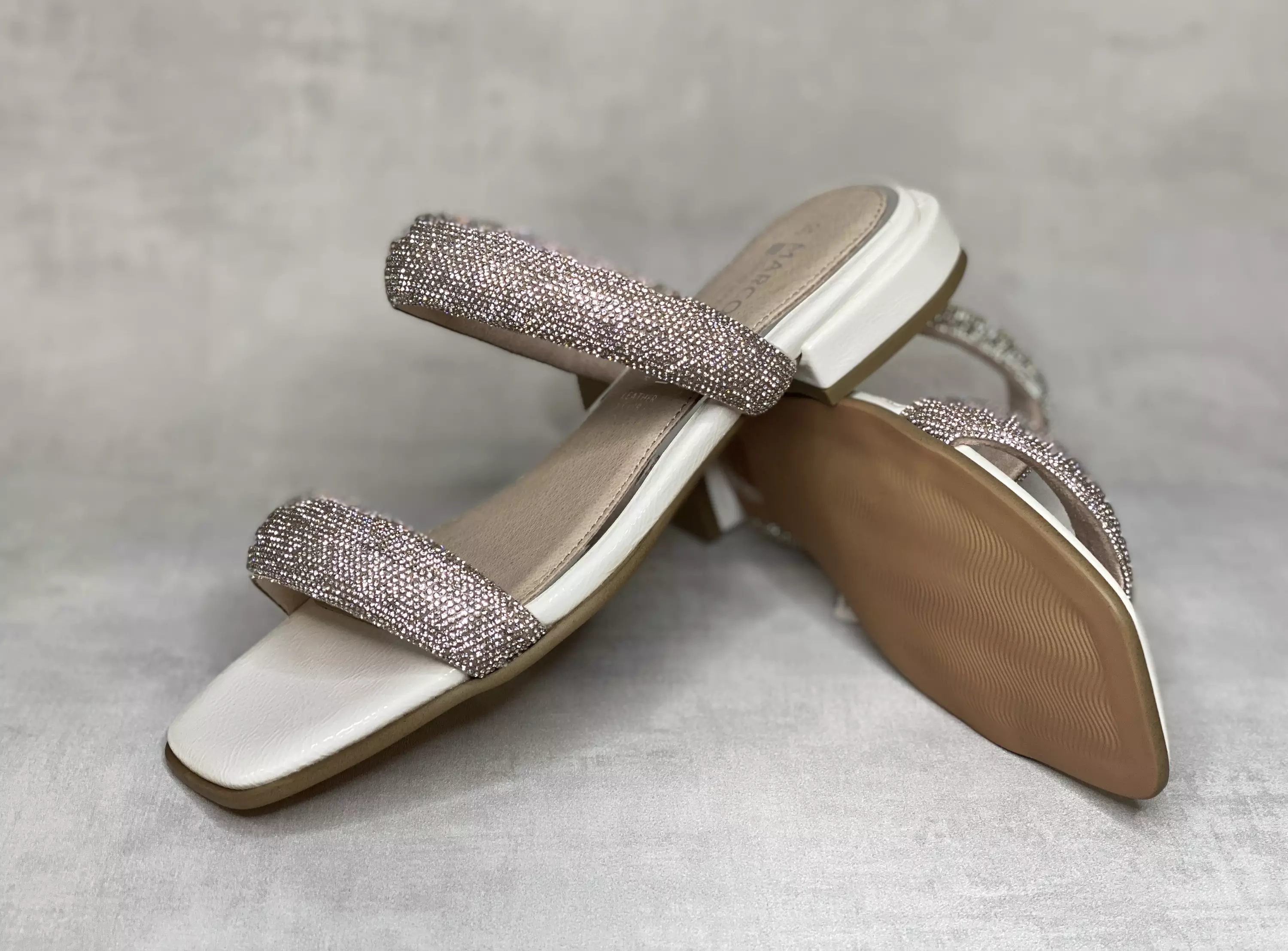 Valkoiset strassikoristeiset Marco Tozzi by Guido Maria Kretschmer sandaalit. Häikäisevän upeat strassikoristeiset pääliremmit taittavat näyttävästi valoa! Valkoinen kärki, korko ja pohjan sivut. Tyylikäs neliön mallinen kärki. Kannan korkeus noin 2,5cm, pohjan korkeus päkiän alta noin 1cm.