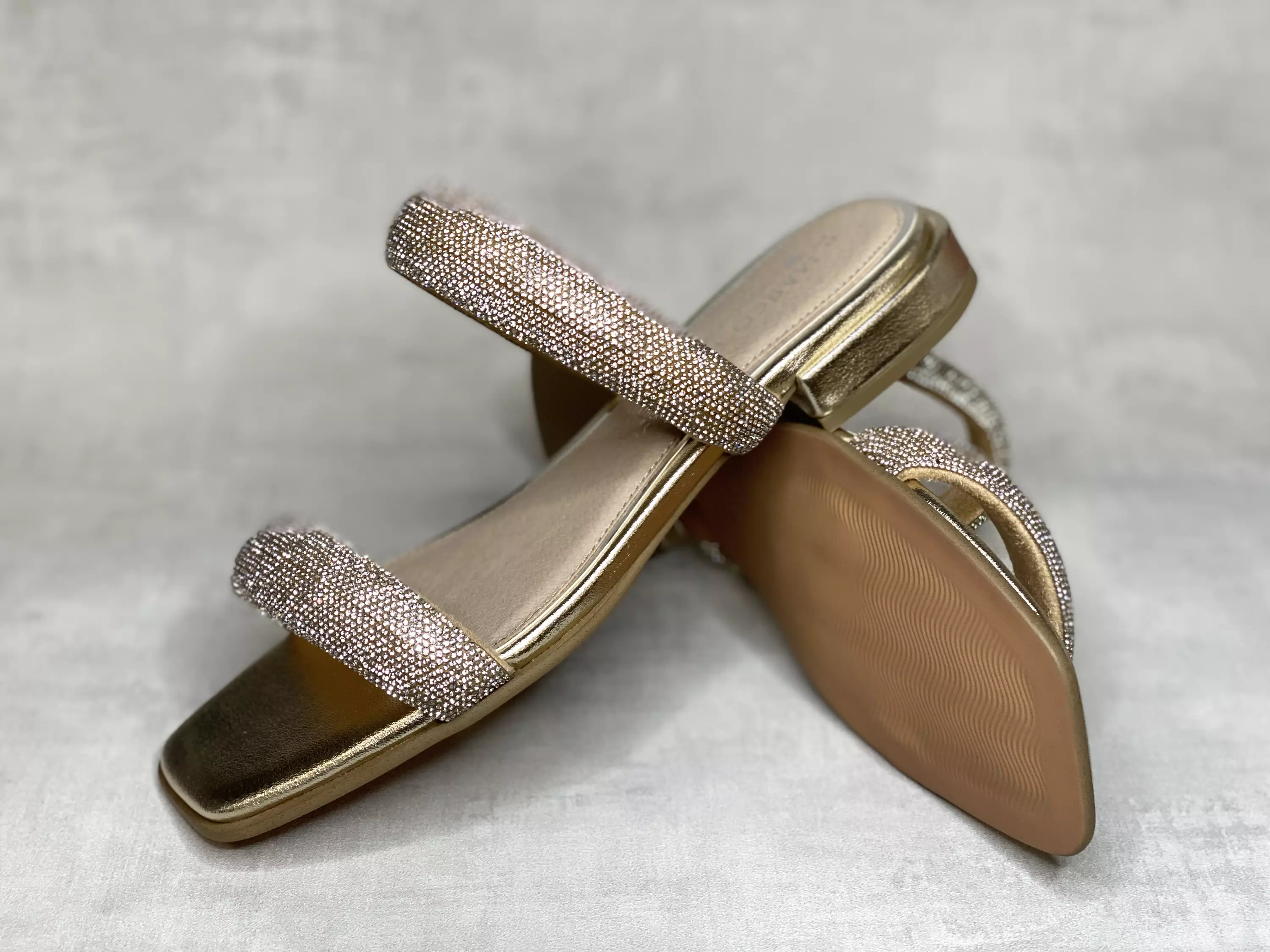 Kultaiset strassikoristeiset Marco Tozzi by Guido Maria Kretschmer sandaalit. Häikäisevän upeat strassikoristeiset pääliremmit taittavat näyttävästi valoa! Kullanvärinen kärki, korko ja pohjan sivut. Tyylikäs neliön mallinen kärki. Kannan korkeus noin 2,5cm, pohjan korkeus päkiän alta noin 1cm.