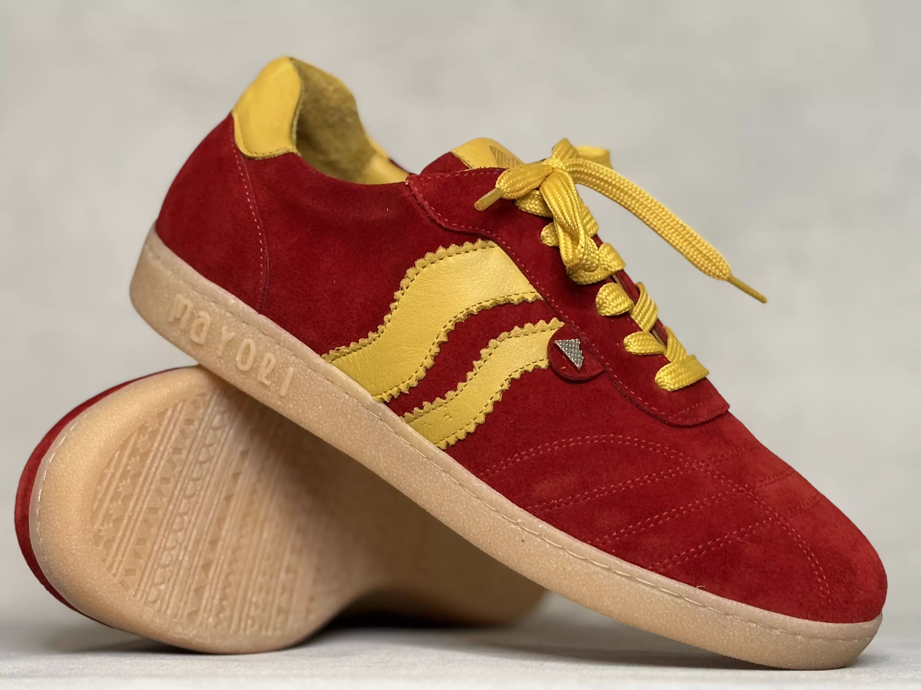 Punaiset Mayori nahkatennarit. Punaisessa mokkanahkaisessa pinnassa on keltaiset pintanahkaiset yksityiskohdat. Ulkosyrjällä nauhoituksen vieressä pieni metallinen Mayori vuori-logo, joka on painettu myös kenkien ilttiin. Nauhojen avulla kengät säätyvät helposti omaan jalkaan sopivan kireälle. Nahkapintaiset pohjalliset ovat vaihdettavat, joten tarvittaessa sujautat kenkiin omia tarpeitsi parhaiten vastaavat pohjalliset. Kanan korkeus noin 2,5cm ja pohjan korkeus päkiän alta noin 1,5cm.