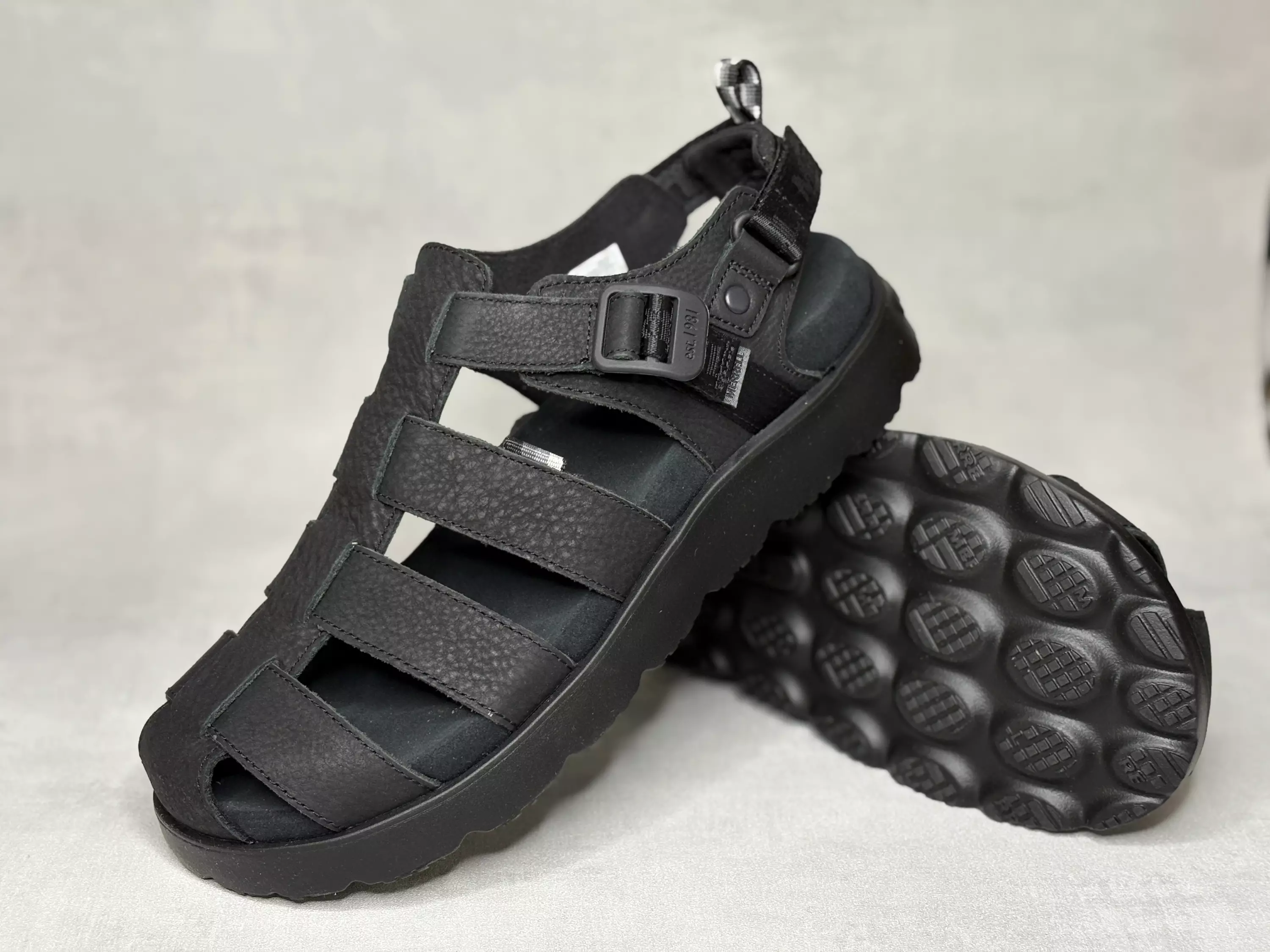 Mustat Merrell Fleur Fisherman sandaalit. Nahkapintaiset sandaalit tekstiilisellä vuorilla. Kantaremmissä kaksi tarralla säädettävää puoliskoa. Ylimmässä remmissä muovisolki ja tekstiilinen säätöremmi. Kannan korkeus noin 3,5cm ja pohjan korkeus päkiän alta noin 2,5cm.