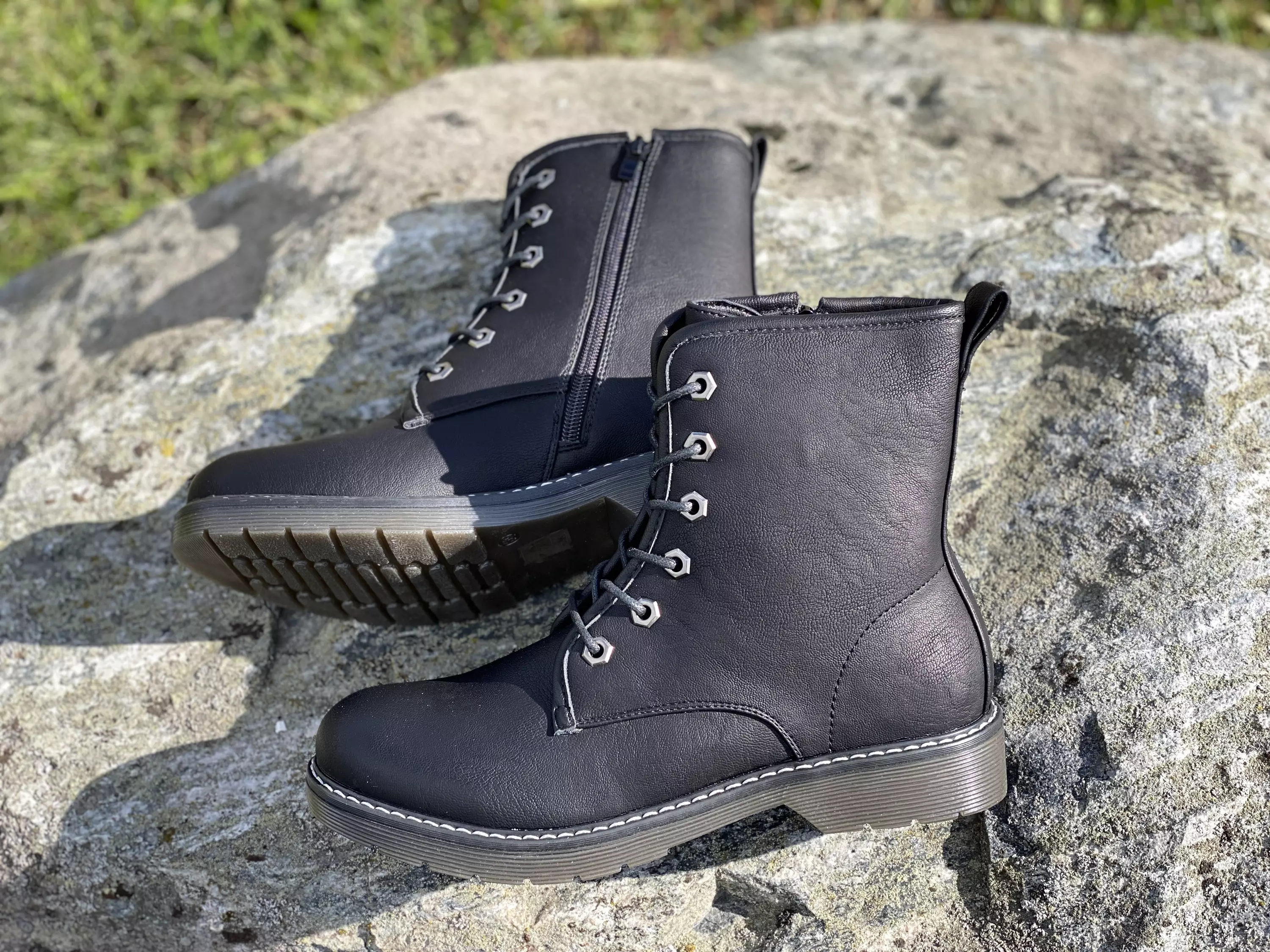 Mustat Migant maiharit. Klassiset maiharit, joissa nauhat sekä sisäsyrjälle sijoitettu vetoketju. Näissä maihareissa nauhat kulkevat näyttävien mutterinmallisten sirkkarenkaiden läpi. Pohjan yläreunassa vaaleanharmaa tikkaus.