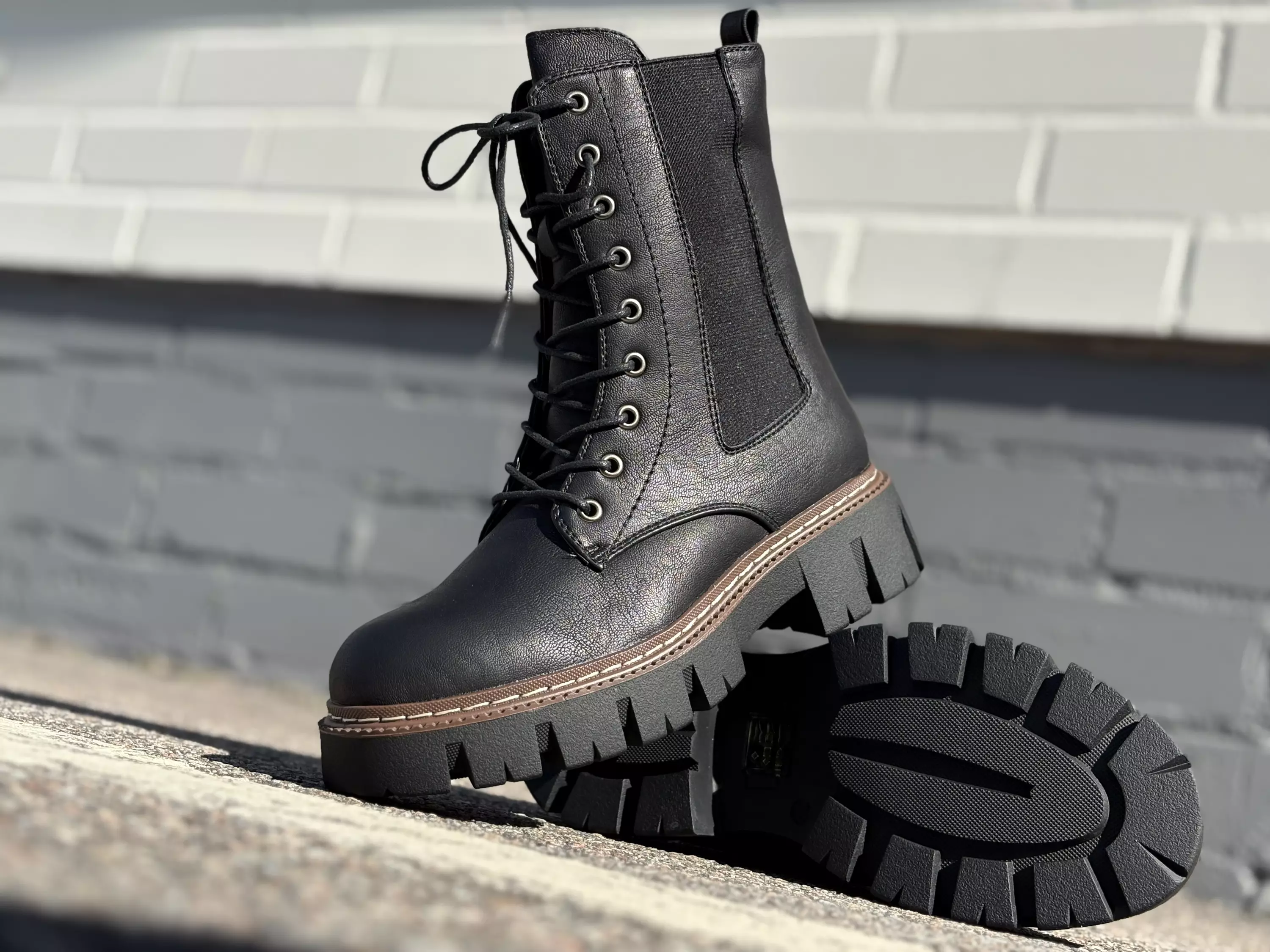 Mustat Migant Alison maiharit. Näyttävällä ulkopohjalla varustetut maiharit. Pohjan ylärunaa kiertää ruskea aksenttiraita, jossa on vaalean beige tikkaus. Maihareiden ulkosyrjällä lisäilmettä antava venyke. Sisäsyrjällä pukemista vauhdittava vetoketju. Nauhojen avulla säädät kengät helposti omaan jalkaan sopivalle kireydelle. Normaali lestimitoitus. Kannan korkeus noin 4,5cm ja pohjan korkeus päkiän alta noin 3cm.