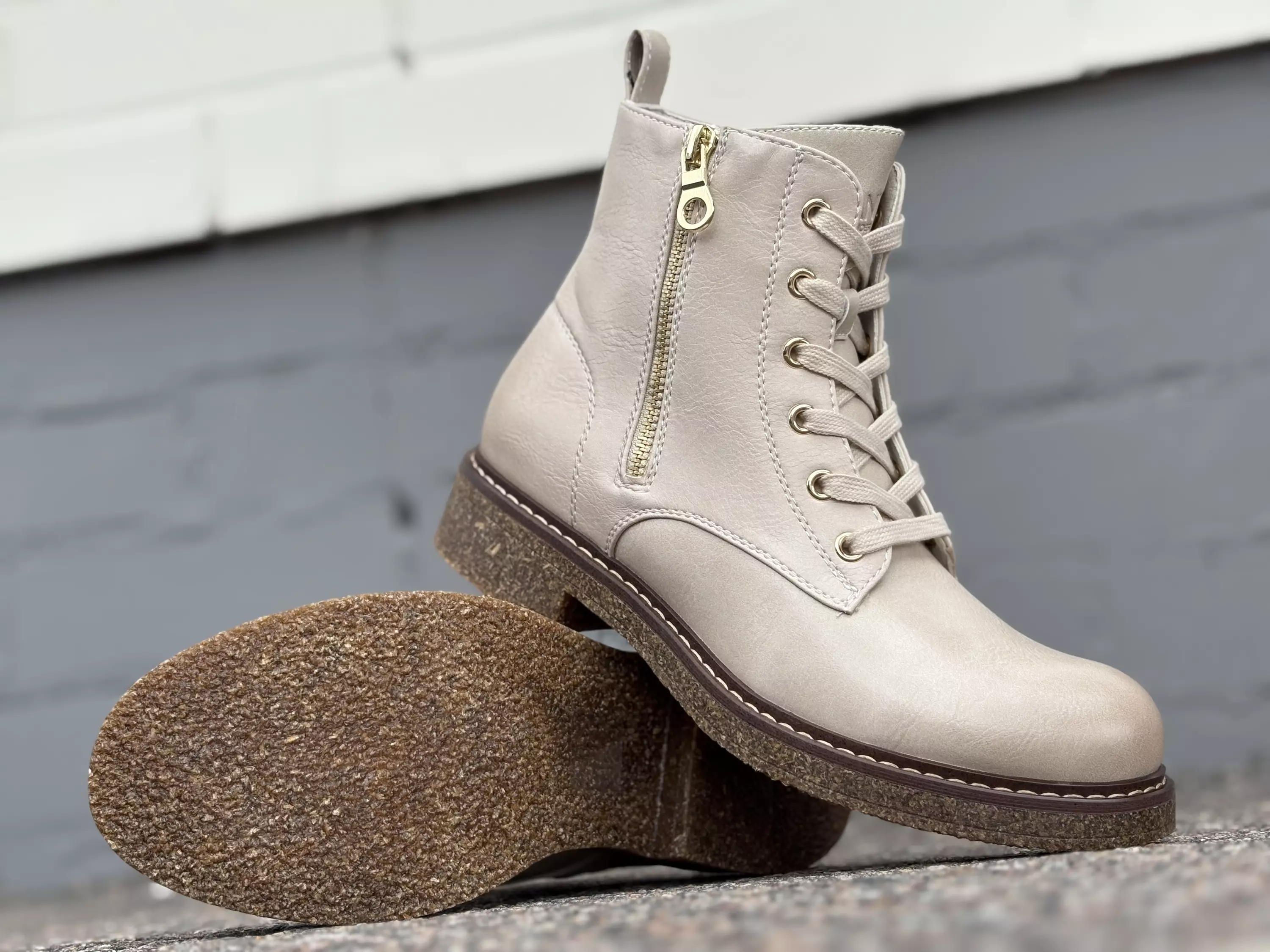 Vaalean beiget Migant Ellie maiharit. Matalavartiset maiharit on varustettu kultaisilla yksityskohdilla. Ulkosyrjälle sijoitettu kultainen koristevetoketju ja kullan väriset nauhoituksen sirkkarenkaat. Ruskea ulkopohja, jossa beiget tikkaukset. Kengän kärki ja kanta ovat hitusen tummemmat, kui muu kenkä. Varren yläosassa vetolenkki. Kengän sisäsyrjällä oleva beige vetoketju vauhdittaa pukemista ja nauhojen avulla säädät kengät omaan jalkaasi istuviksi. Lestimitoitukseltaan nämä maiharit ovat normaalia mitoitusta. Kannan korkeus noin 3cm ja pohjan korkeus päkiän alta noin 1,5cm.