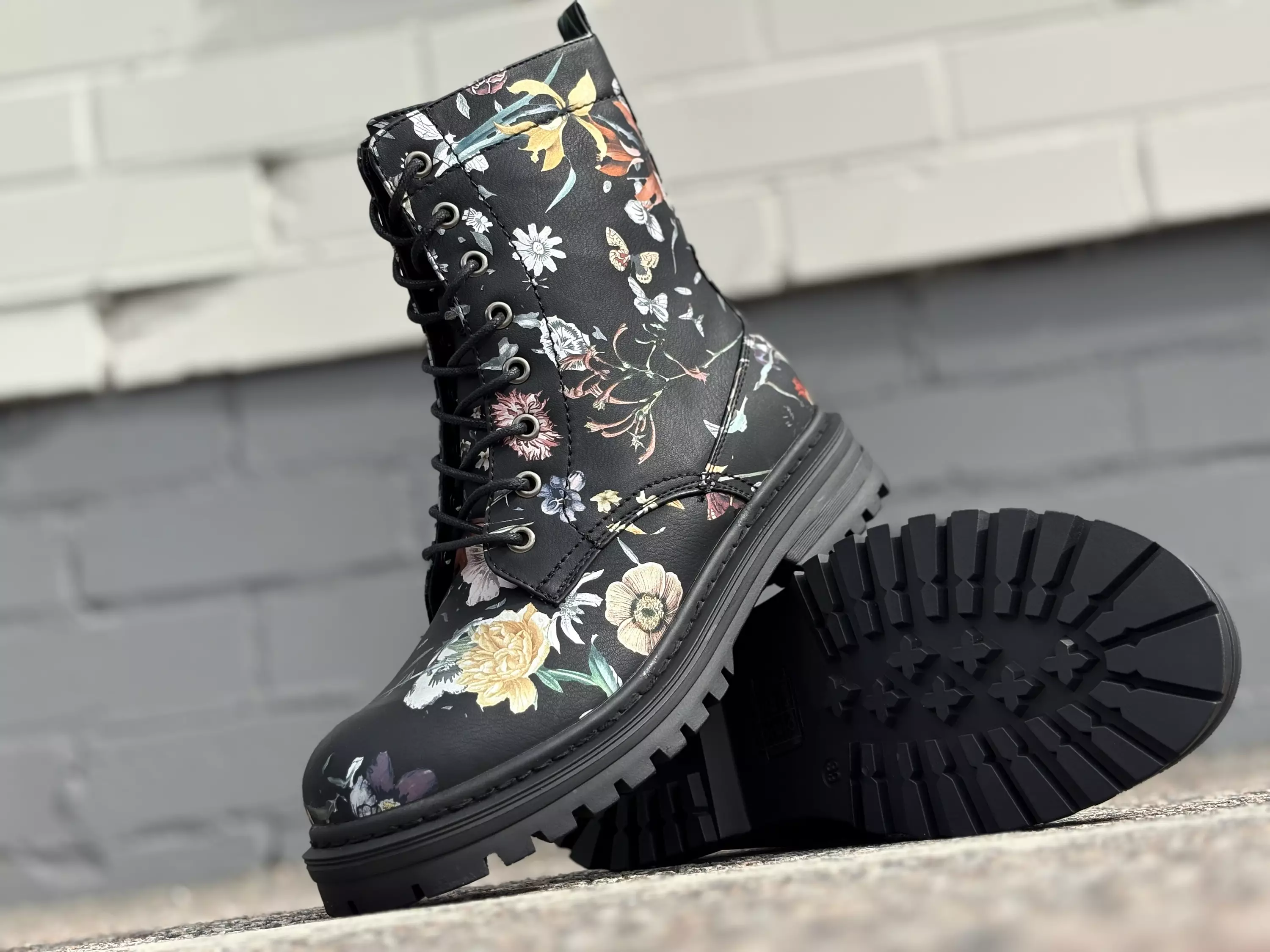 Mustat Migant Jazmin Black Flower maiharit. Pohjaväriltään mustat maiharit, joissa herkkä monivärinen kukkakuviointi. Kenkien pinnassa lepattaa myös perhosia. Sisäsyrjällä pukemista vauhdittavat vetoketju. Nauhojen avulla säädät kengät omaan jalkaasi sopivan kireälle. Varren yläosassa takana pieni vetolenkki. Tilavahko lesti, jossa on varsin hyvin varvastilaa myös korkeussuunnassa. Kannan korkeus noin 3,5cm ja pohjan korkeus päkiä alta noin 2cm.