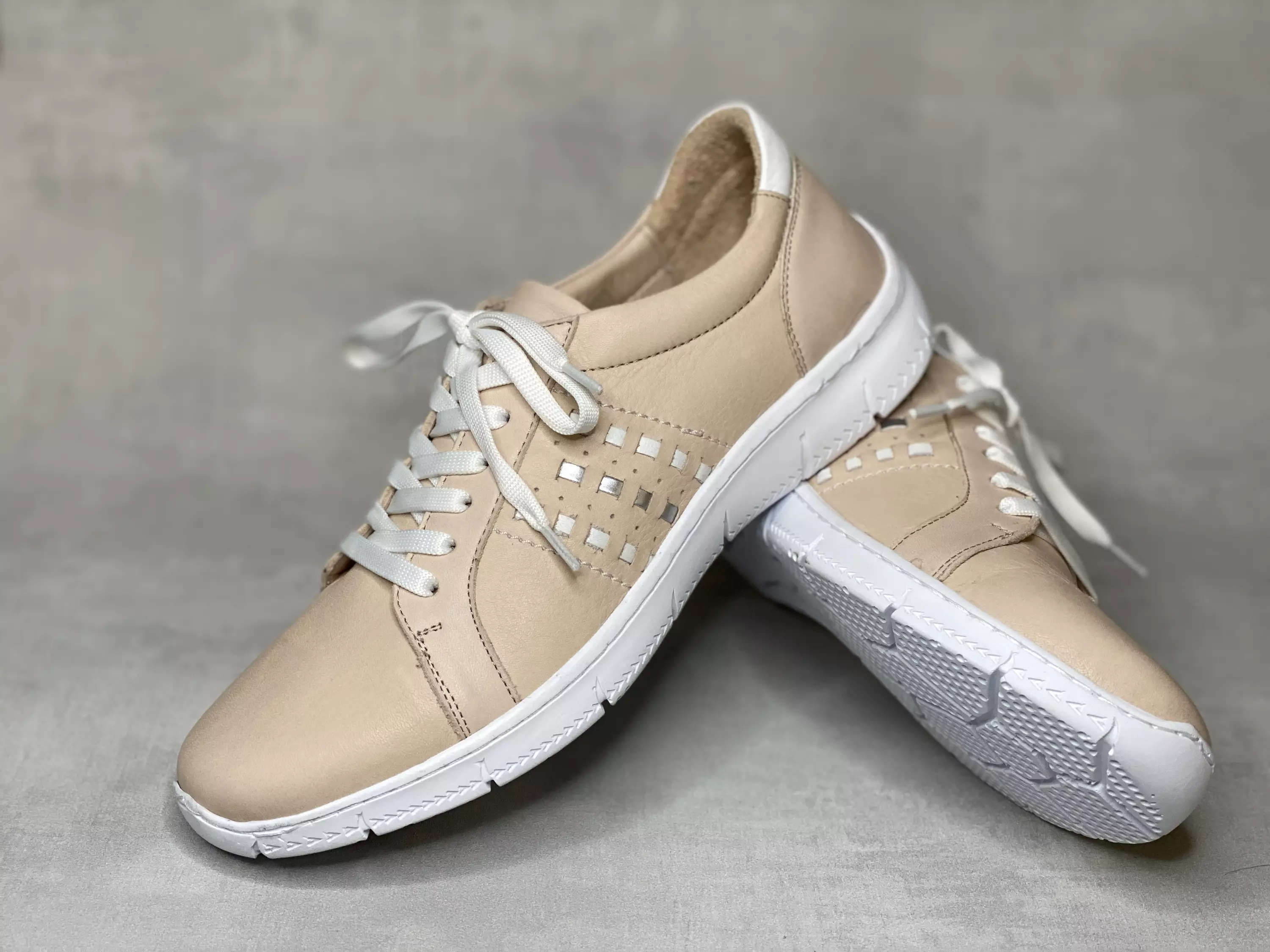 Nudet Migant kävelykengät. Nauhalliset nahkapintaiset ja -vuoriset tennarityyppiset kävelykengät. Ulkosyrjällä kaksi valkoista ja yksi hopeinen tehosteraita. Pehmeät pohjalliset ovat vahdettavat, joten tarvittaessa vaihdat näihin tennareihin omia tarpeitasi parhaiten vastaavat pohjalliset. Nahkakengät mukautuvat käytössä jalkaan.