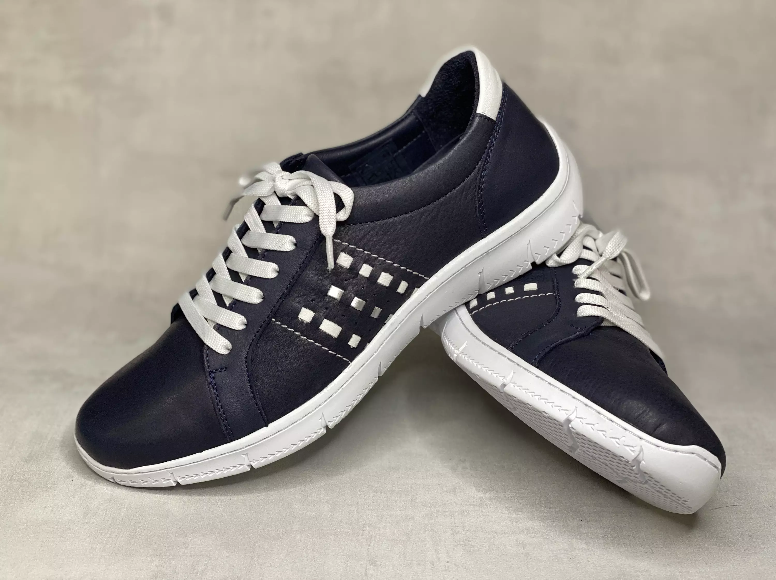 Tummansiniset Migant kävlöykengät. Nauhalliset nahkapintaiset ja -vuoriset tennarityyppiset kävelykengät. Ulkosyrjällä kaksi valkoista ja yksi hopeinen tehosteraita. Pehmeät pohjalliset ovat vahdettavat, joten tarvittaessa vaihdat näihin tennareihin omia tarpeitasi parhaiten vastaavat pohjalliset. Nahkakengät mukautuvat käytössä jalkaan.