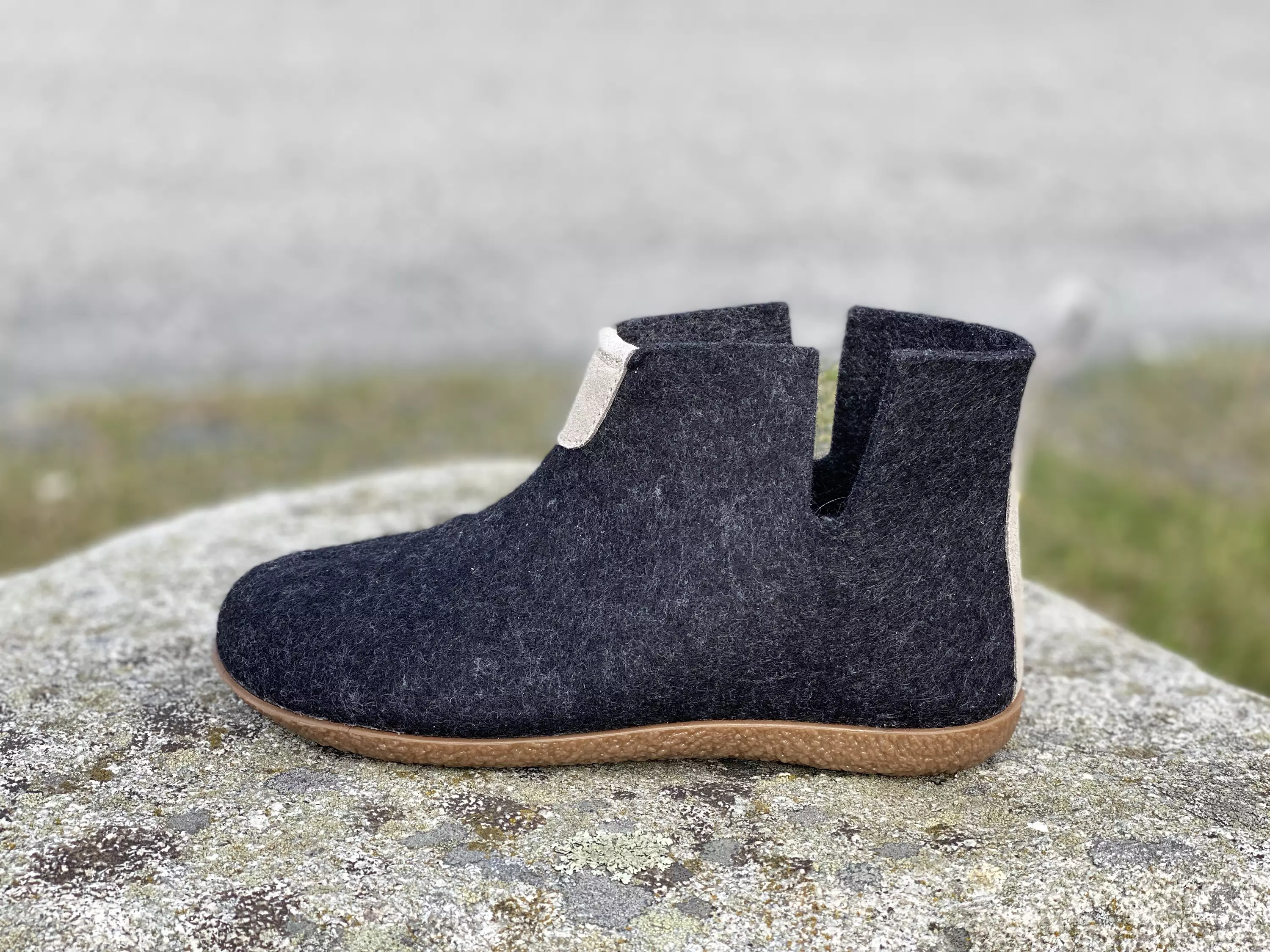 Mustat Migant huopatossut. Materiaali on lämmintä huovutettua villaa. Sisäpohjallinen on muotoiltu ja tarpeen vaatiessa irrotettava/vaihdettava.Tossujen ulkopohja on kumisekoitetta.