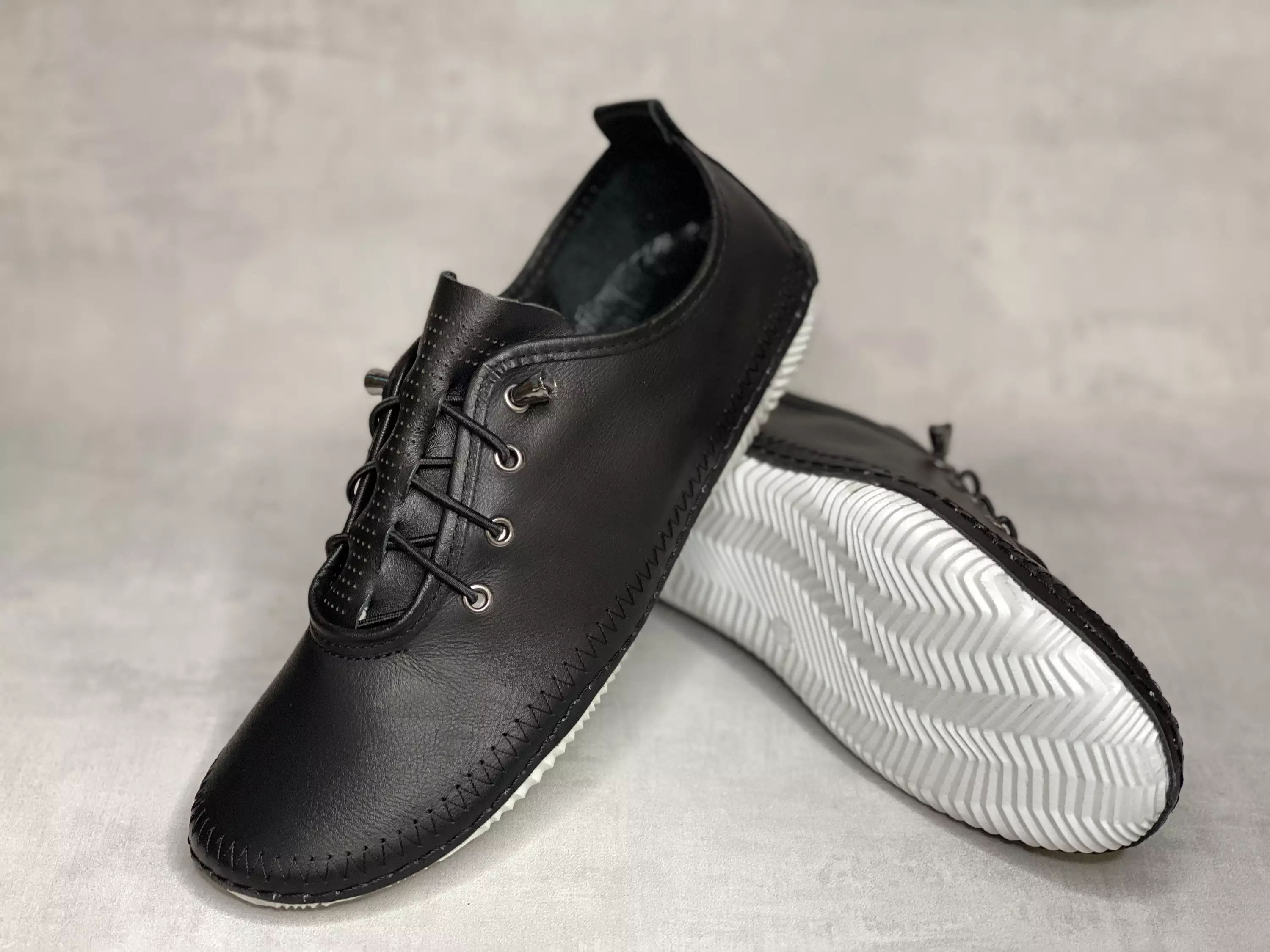 Mustat Migant kävelykengät. Nahkaiset venykenauhaiset kesäkengät. Mustat venykenauhat joustavat jalkaan laittaessa. Kenkien pohja on kärjestä paljasjalkakenkämäisen taipuisa, mutta kannan alta tämä kenkä ei täytä paljasjalkakengän rullautuvuuden kriteerejä.