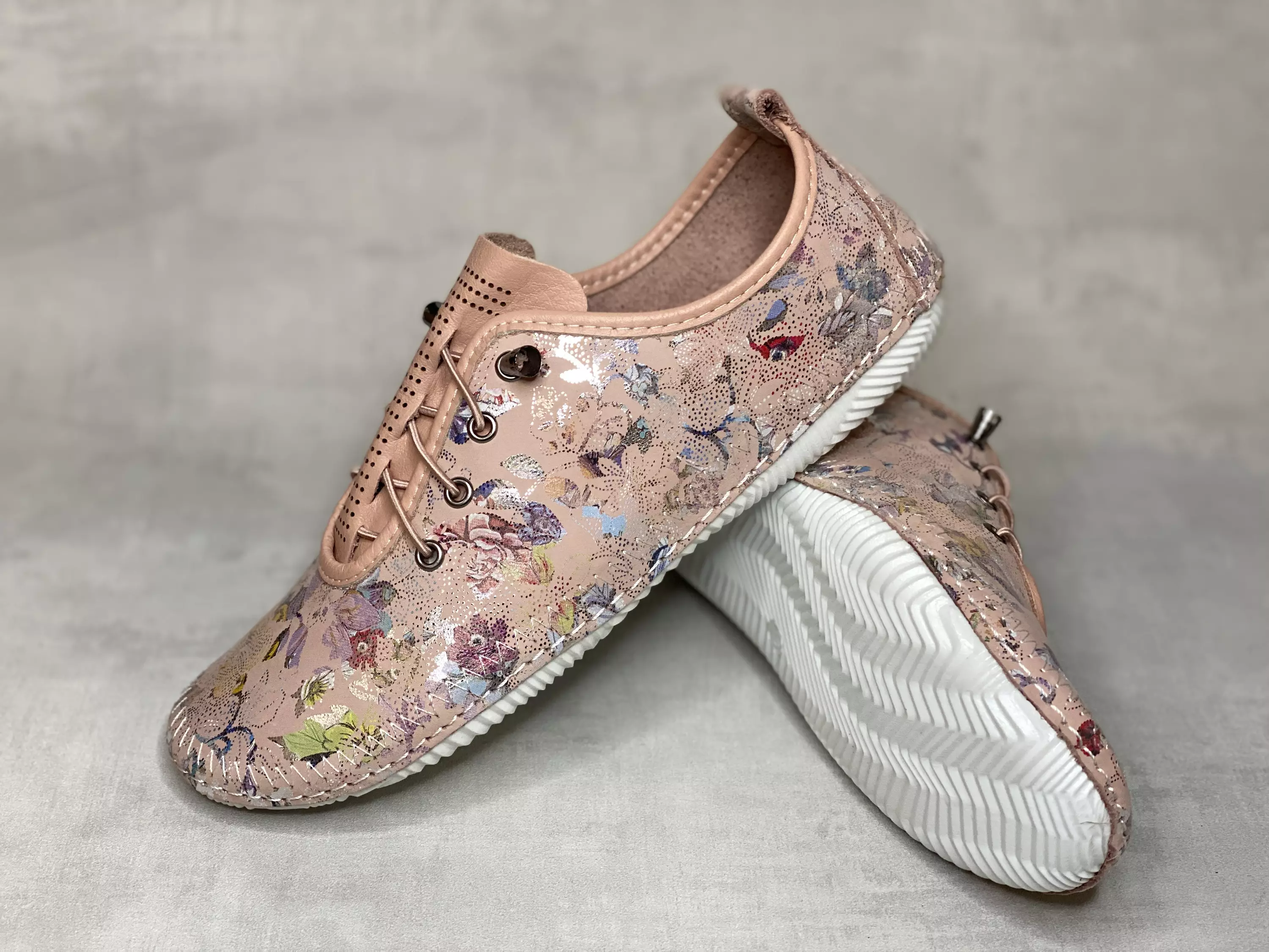 Vaaleanpunaiset kukkakuvioiset Migant kävelykengät. Nahkaiset venykenauhaiset kesäkengät. Vaaleanpunaiset venykenauhat joustavat jalkaan laittaessa. Kenkien pohja on kärjestä paljasjalkakenkämäisen taipuisa, mutta kannan alta tämä kenkä ei täytä paljasjalkakengän rullautuvuuden kriteerejä.