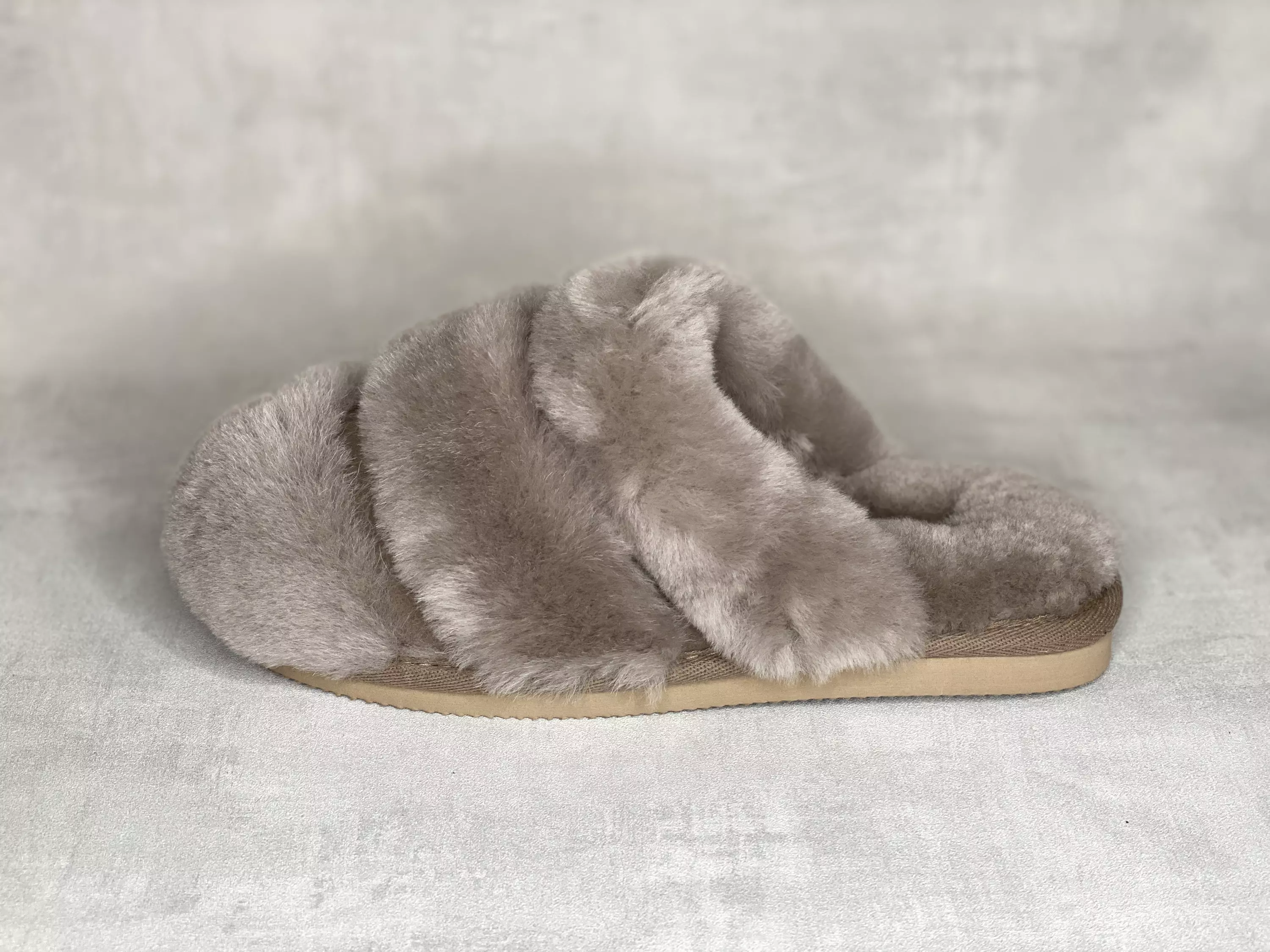 Harmaat pörröiset Mjúka aamutossut. Pörröinen tossu pitää varpaat lämpiminä talven viileydessä. Pinta ja vuori ovat molemmat nahkaa.