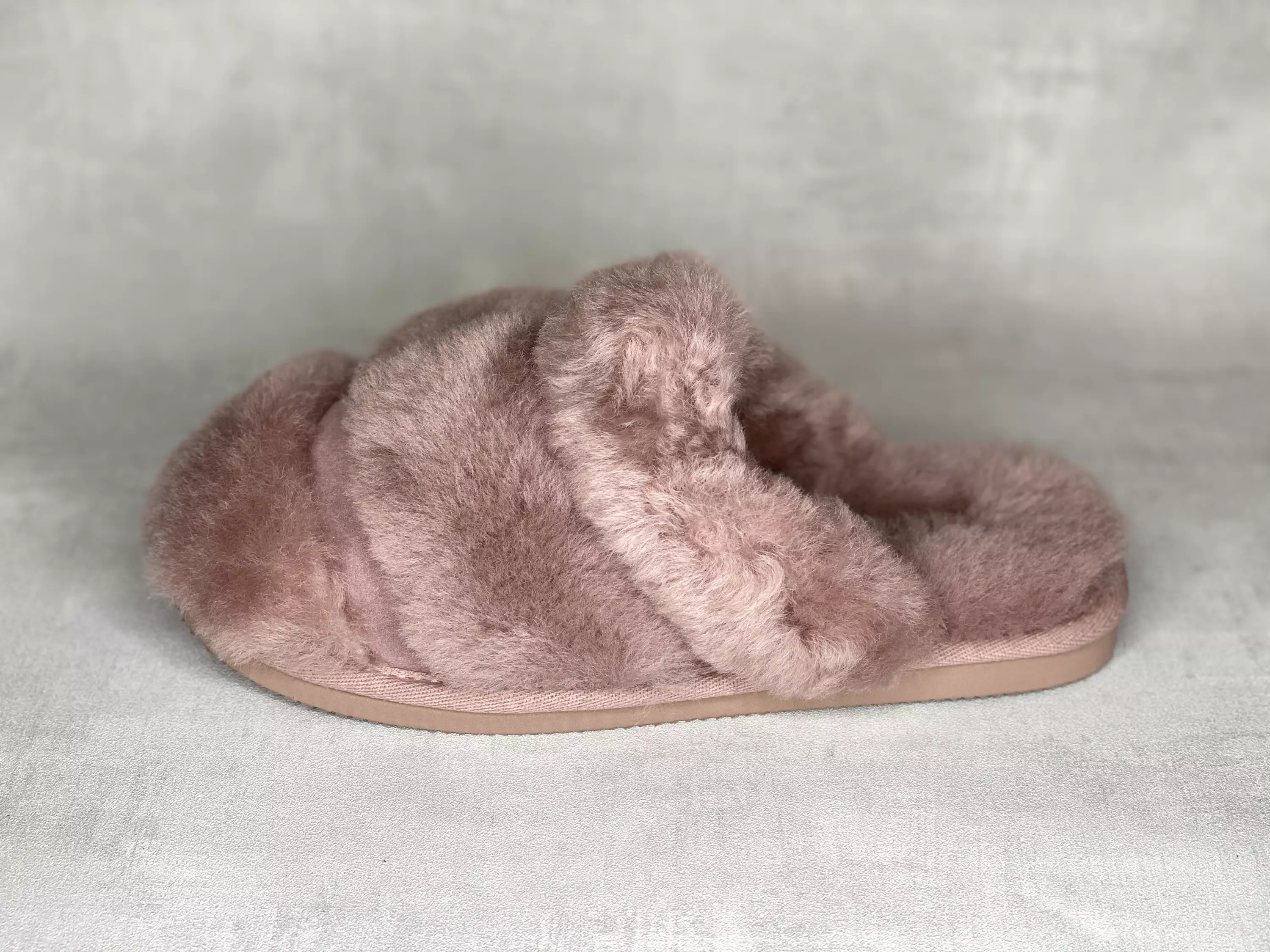 Vaaleanpunaiset pörröiset Mjúka aamutossut. Pörröinen tossu pitää varpaat lämpiminä talven viileydessä. Pinta ja vuori ovat molemmat nahkaa.