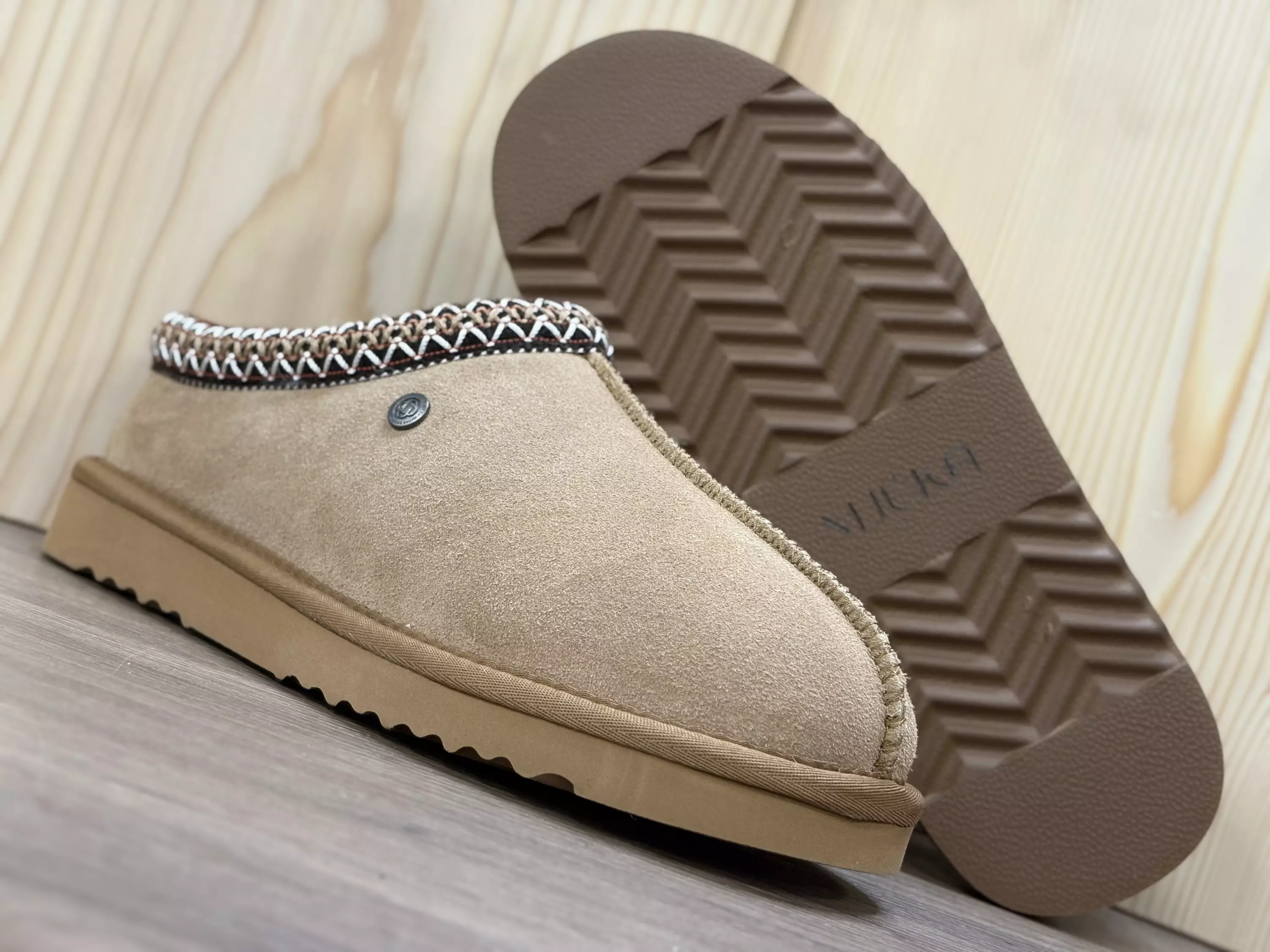 Vaaleanruskeat Mjúka Yrsa aamutossut. Pörrövuoriset lämpimät aamutossut. Kengänsuussa sievä koristenauha. Keskellä edessä ilmettä tuova sauma. Lestimitoitus normaali, mutta koot itsessään ovat noin puoli numeroa normaalia pienempiä. Kannan korkeus 3cm ja pohjan korkeus päkiän alta noin 2cm.