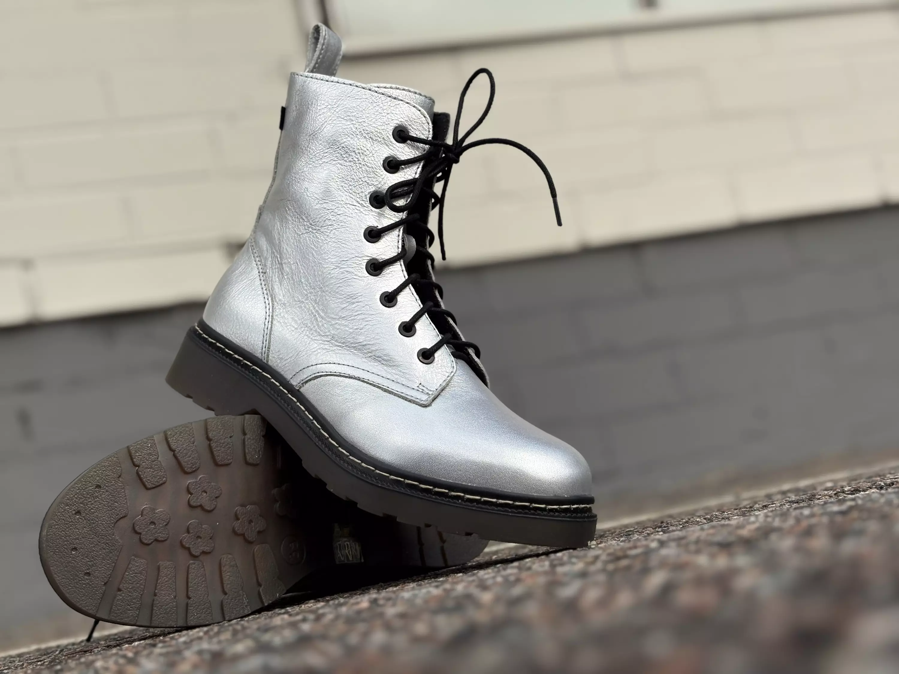 Hopeiset Musse & Cloud Efany SIL maiharit. Pohjan yläreunassa beiget tikkaukset. Klassiset nauhalliset maiharit kiiltävällä hopeisella nahkapinnalla. Sisäsyrjälle sijoitettu vetoketju helpottaa maihareiden pukemista. Varren takaosassa nahkainen vetolenkki. Ohut tekstiilivuori. Kengät tulevat mustien nauhojen kanssa. Mikäli haluat hankkia kengännauhat itse, näihin maihareihin tarvitaan noin 150cm pitkät nauhat! Kannan korkeus noin 4cm, pohjan korkeus päkiän alta noin 2cm.