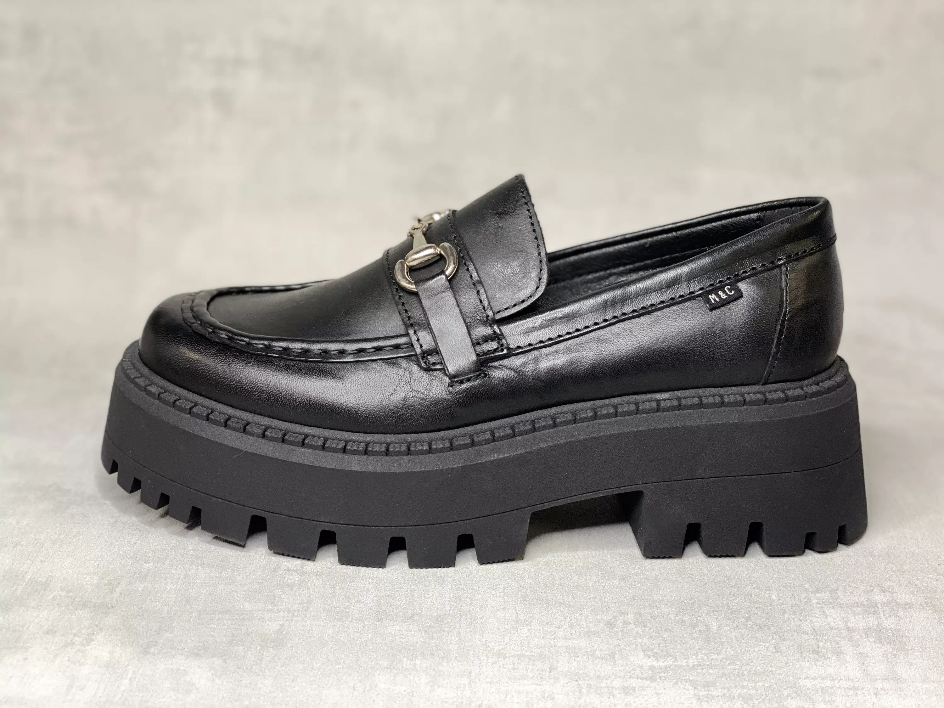 Mustat Musse & Cloud Selly loaferit. Musatt nahkaiset loaferit metallinvärisellä kärkikoristeella. Alleen nämä loaferit ovat saaneet ärhäkän näköisen paksun pohjan!
