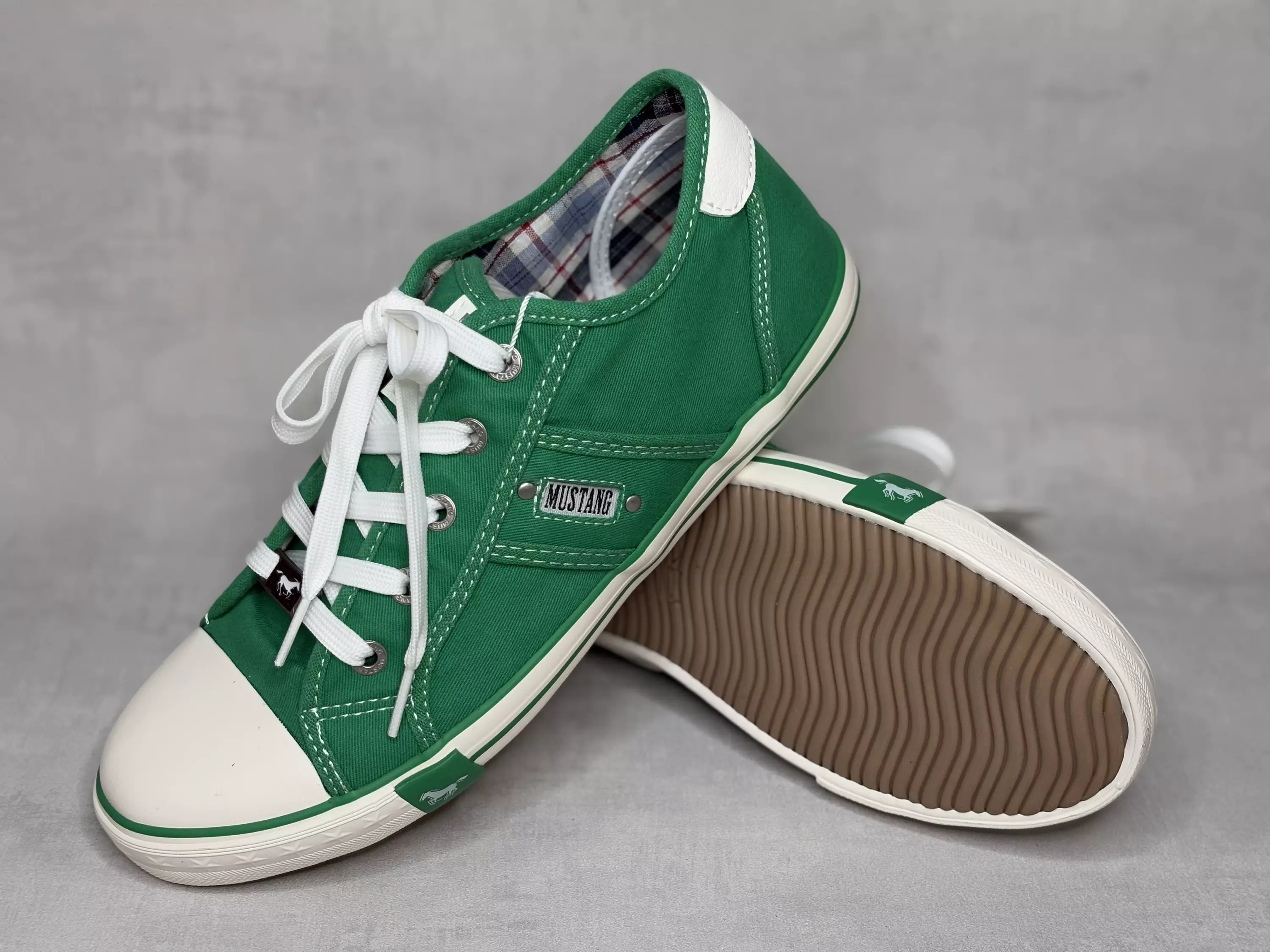 Vihreät Mustang tennarit. Perinteiset matalavartiset tekstiilitennarit nyt kesäisessä vihreässä värissä! Valkoiset kengännauhat, joissa pieni mustangilla kuvioitu metallisomiste. Valkoisessa pohjan sivussa vihreä raita ja vihreällä pohjalla kirmaavat valkoiset mustangit. Iltissä valkoisella pohjalla Mustang logo. Ruutukuvioinen tekstiilivuori. Valkoinen yksityiskohta löytyy myös kengän kannasta. Kannan korkeus noin 1,5cm ja pohjan korkeus päkiän alta noin 1cm.