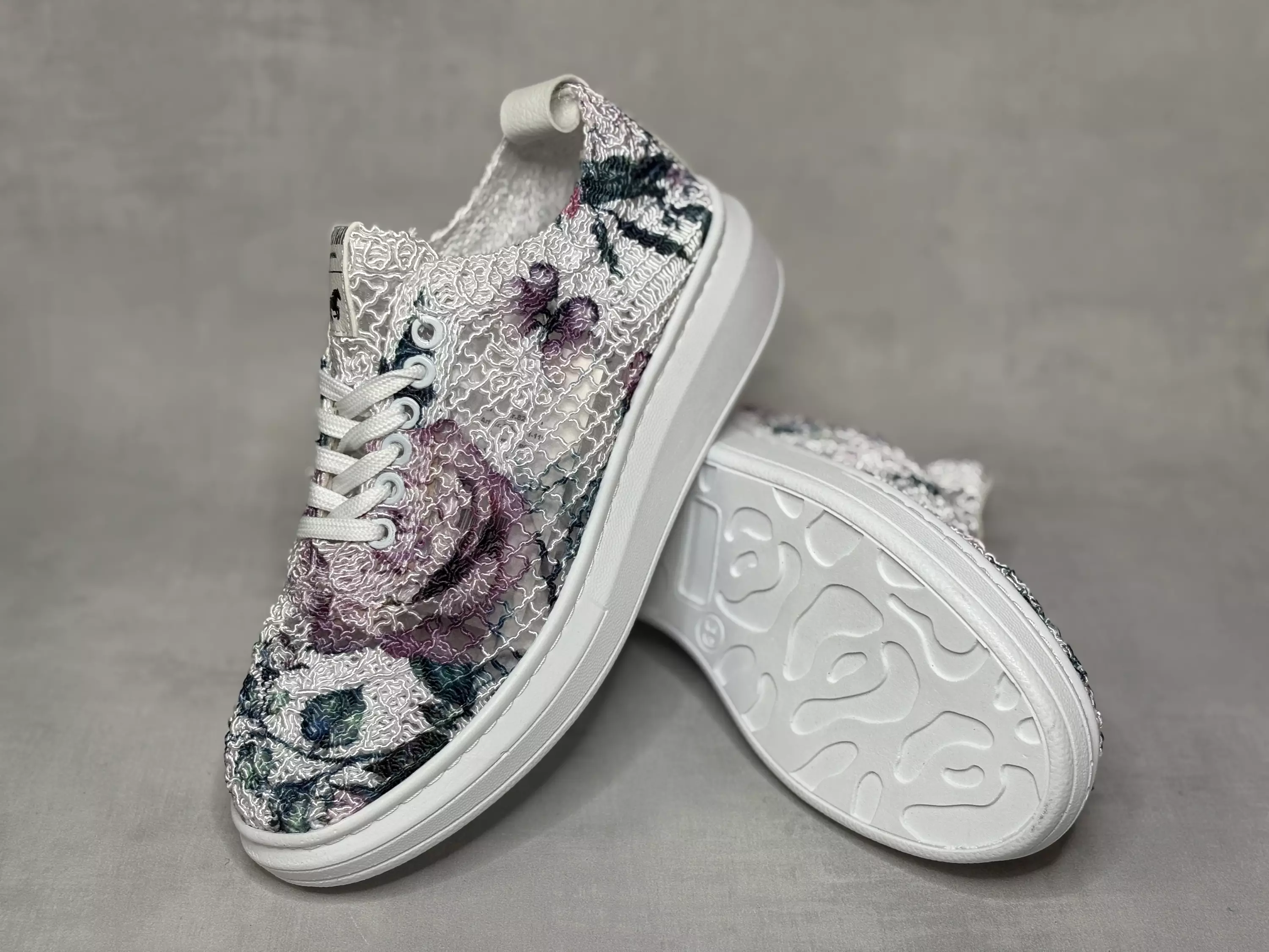Valkoiset kukka- ja lehtikuvioilla varustetut Mustang pitsitennarit ovat ihanan romanttinen valinta lämpimiin kesäpäiviin! Läpinäkyvään kenkään saat lisää ilmettä laittamalla kirkkaanväriset nilkkasukat tai vaihtamalla kenkiin satiiniset kengännauhat.