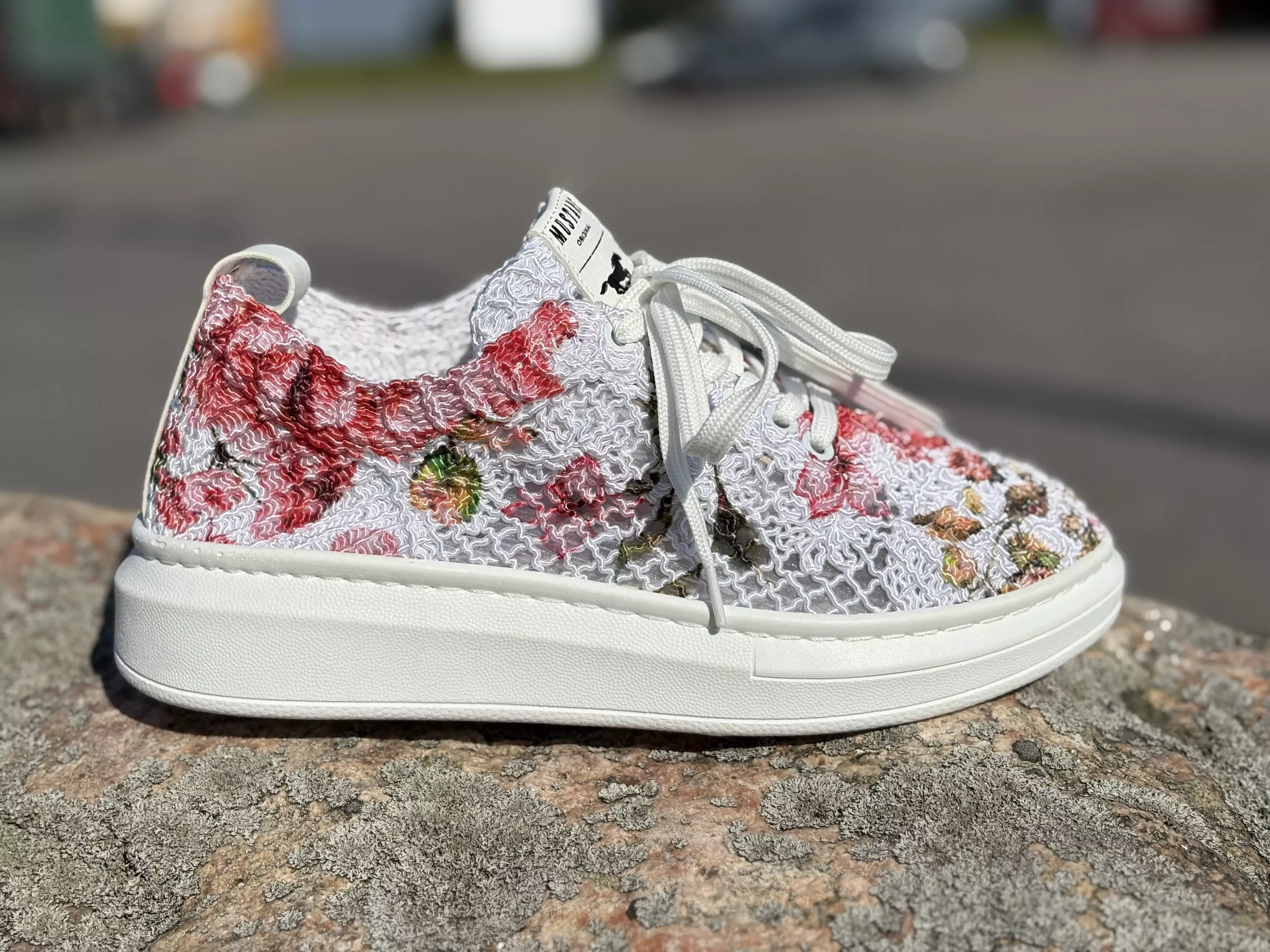 Valkoiset kukka- ja lehtikuvioilla varustetut Mustang pitsitennarit ovat ihanan romanttinen valinta lämpimiin kesäpäiviin! Läpinäkyvään kenkään saat lisää ilmettä laittamalla kirkkaanväriset nilkkasukat tai vaihtamalla kenkiin satiiniset kengännauhat.