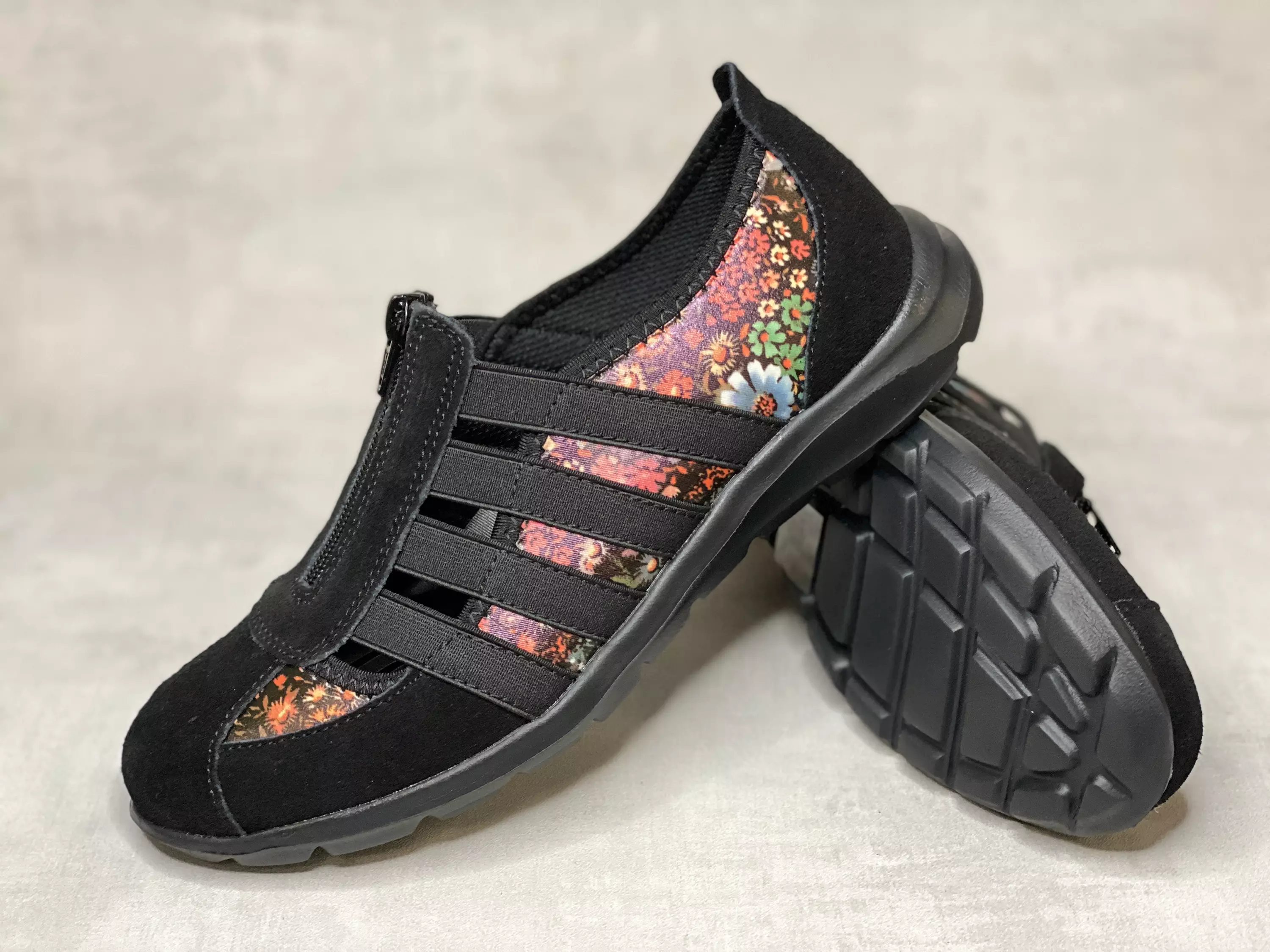 Mustat kukkakuvioiset Natura Christine tennarit. Sisä- ja ulkosyrjällä ihanat kukkakuviot, jotka vaihtelevat punaisen, oranssin ja sinisen sävyissä. Jokainen pari on kuvioiden kohdistumisen suhteen uniikki! Kesäiset tennarit, joissa on keskellä edessä vetoketju, joka toimii sekä yksityiskohtana että helpottaa pukemista. Kengän sisä- ja ulkosyrjällä on istuvuutta parantavat venykkeet. Kengän pohjallinen on kevyesti muotoiltu. Kantapään kohdalla on hieman paksumpi pehmuste, jonka lisäksi pohjallisessa on pieni holvikaaren tuki. Pohjallinen on vaihdettavissa, joten tarpeen vaatiessa sen tilalle sujahtaa omaan jalkaasi parhaiten sopiva pohjallinen.